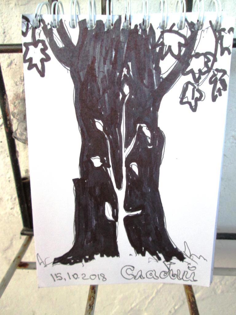 Здесь в первую очередь мне пришли в голову выжженные душа или сердце. Нарисовать хотелось выжженный очаг и склоненную к нему фигуру женщины в чёрном. Такой поникший силуэт. Но это требует времени, и я решила нарисовать выжженную землю после пожара.