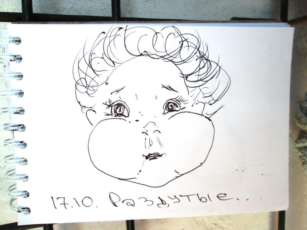 Вторым вариантом перевода этого задания было "развращенный", но я не стала за него браться. Развращённый должен быть хорошо нарисован. Он достоин большего, чем мои почеркушки. Решила, что это раздутые щёки.