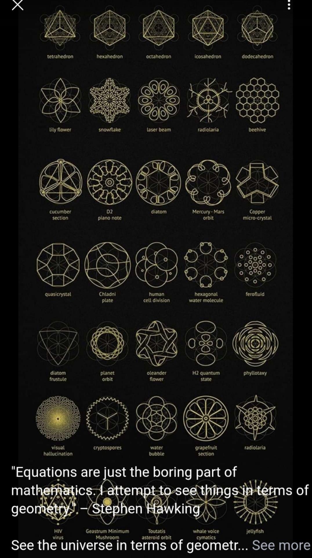 Все, что кажется нам твердым, является на самом деле вибрацией. Природа это бездна пульсаций, колебаний, волновых движений, ритмов и циклов с большим диапазоном универсальных энергий, все из которых, полностью определяются амплитудой и частотой. Частотата выражается числом. А число выражается фигурой, формой, патерном (шаблоном) - что и является геометрией. Геометрия это и есть шаблон (tamplate), по которому Генеральный Архитектор нашей вселенной управляет процессом создания. Священая геометрия это школа мыслей. Это учение о универсальном порядке.