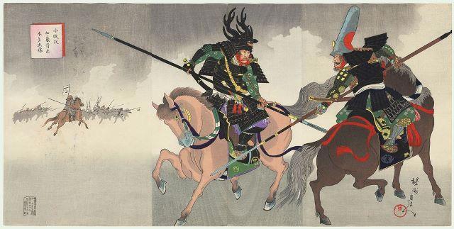 Поединок Като Киёмаса и Ямадзи Сёгэн во время битвы при Сидзугатакэ. Гравюра Тоёхара Тиканобу, 1904 г.