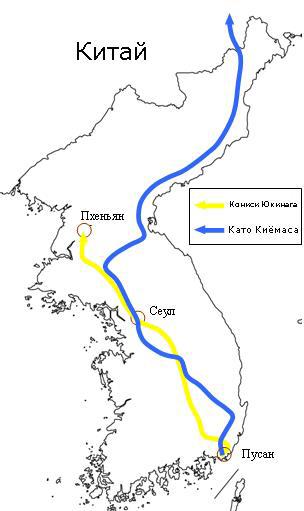 Войска были разделены на восемь армий, но главные ударные силы были сосредоточены в трех — под командованием Като Киёмаса, Кониси Юкинага и Куродыа Нагамаса. И именно они были в первую очередь отправлены в Корею.