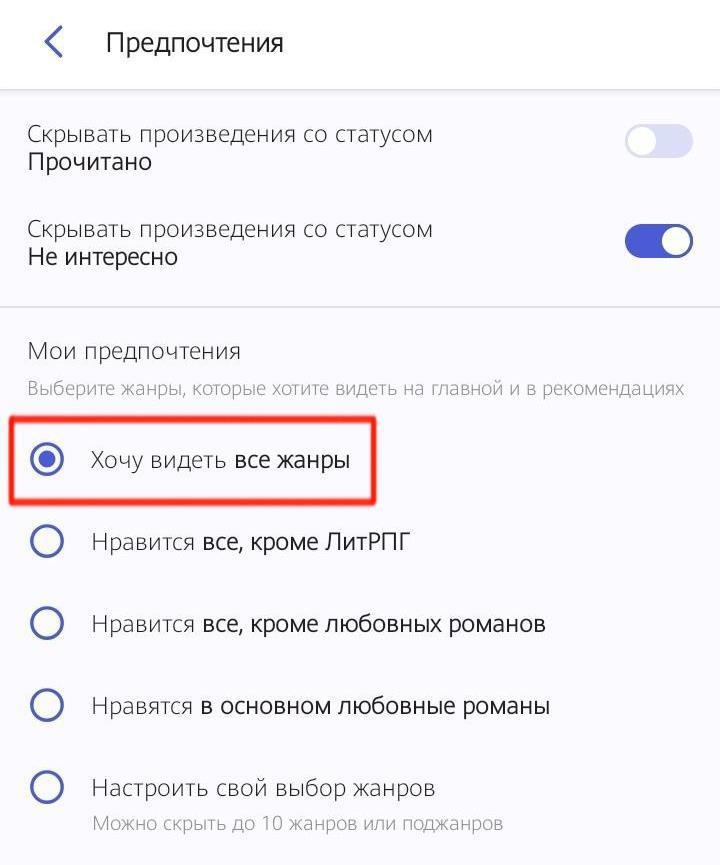 Вам не нужно выбирать стандартное «Все жанры», ведь именно оно отключает все книги 18+. Почему? Я не знаю. Зато знаю, как вернуть их вам.