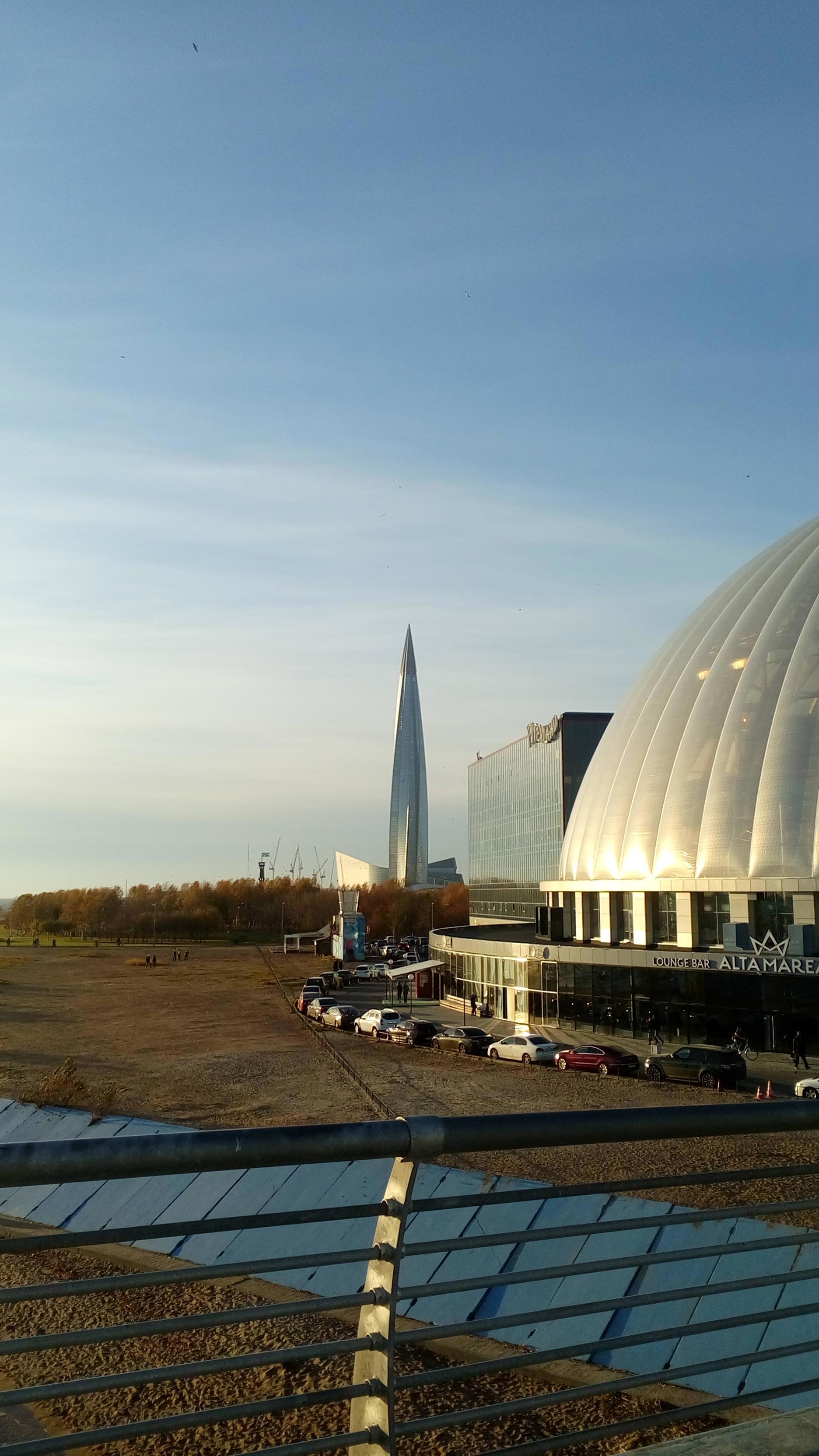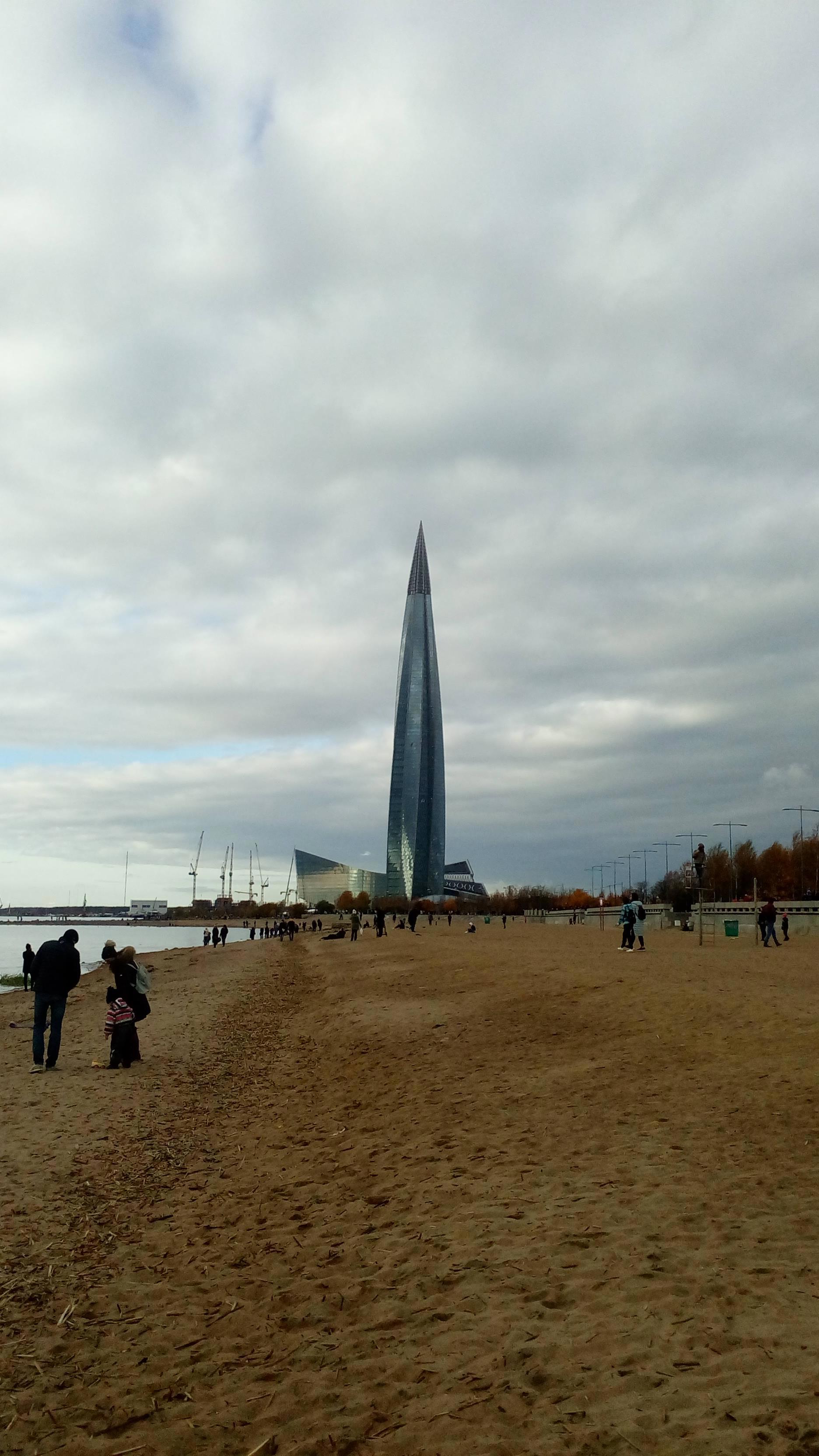«Кукурузина» в своих серых тонах при такой погоде смотрелась не так угрожающе фоном для парка 300-летия Петербурга. Было пасмурно, похолодало.