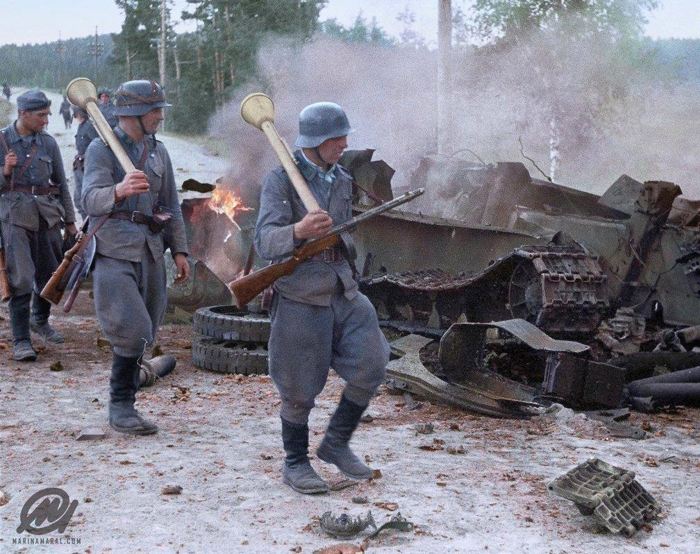 Автор: Евгений Крас22 июня 1941 года. Для нас дата трагическая. Тяжёлая встреча Красной Армии с вооружённой бандой объединённой Европы. Высокий уровень организации, опыт боёв сделали своё дело и нашим пришлось, истекая кровью откатываться до самой Москвы. Однако и евробанда была сильно смущена. Первая неожиданность – противник не стал разбегаться, а оказал ожесточённое сопротивление. Второй шок – встреча с новейшими образцами советской техники. Через короткое время главные противники – немцы большой удачей считали добыть наши образцы стрелкового оружия. В основном это были СВТ, ППШ, ППД. Привела бандитов и артиллерия. Часть образцов была принята Вермахтом на вооружение. Однако главный шок вызвали танки Т-34 и КВ. Остальные тоже оказались очень неплохими, но с ними ещё можно было как-то бороться, но с этими возникли проблемы. Европейские танковые части таяли прямо на глазах. С этим нужно было срочно что-то делать. Положение спасали собственные зенитки, захваченные у нас Ф-22, ЗИС-2 и ЗИС-3. Потом наладили выпуск кумулятивных боеприпасов. Однако этого было всё равно мало.