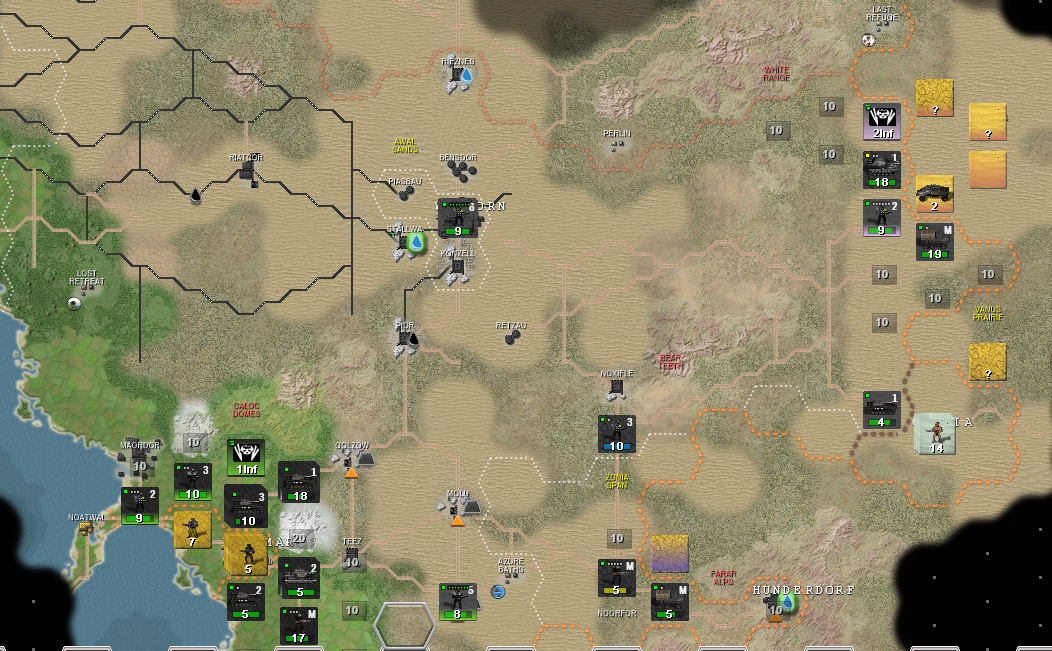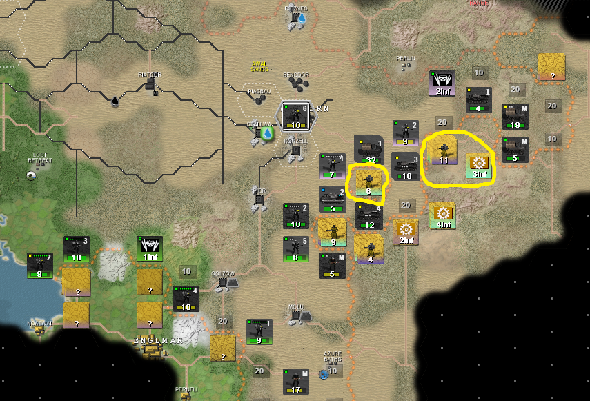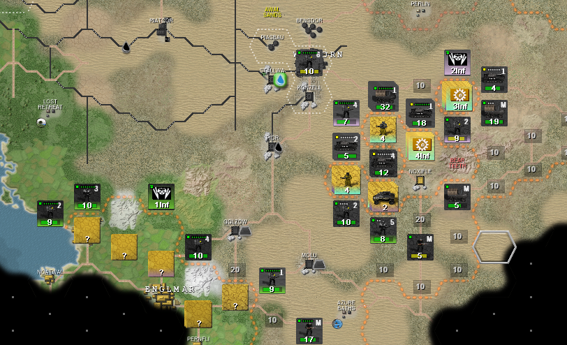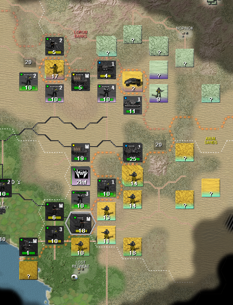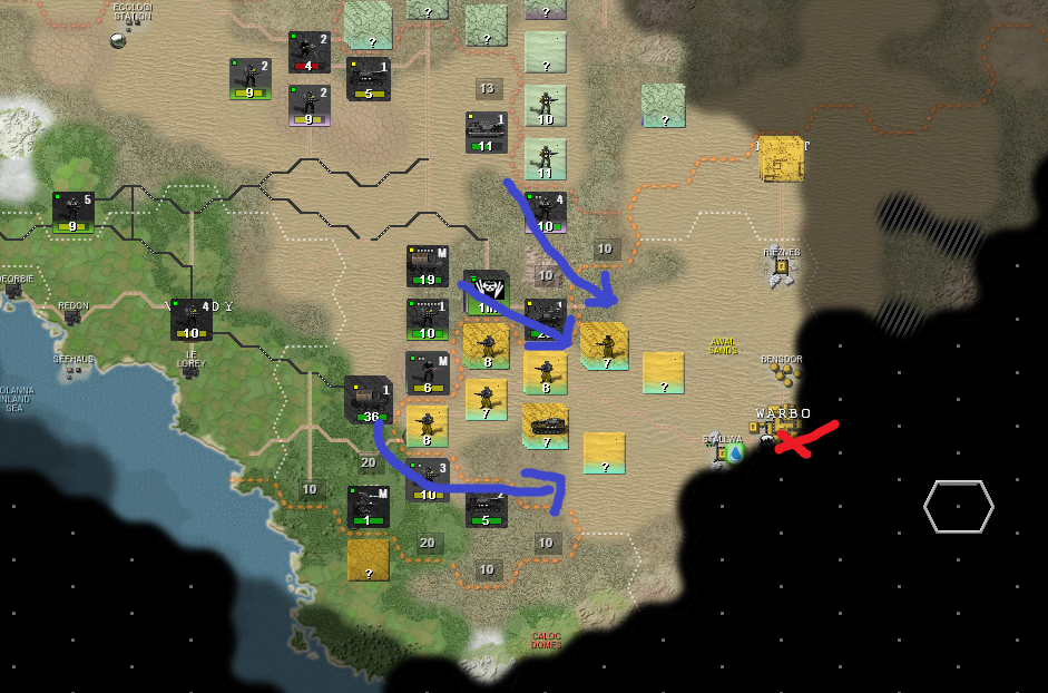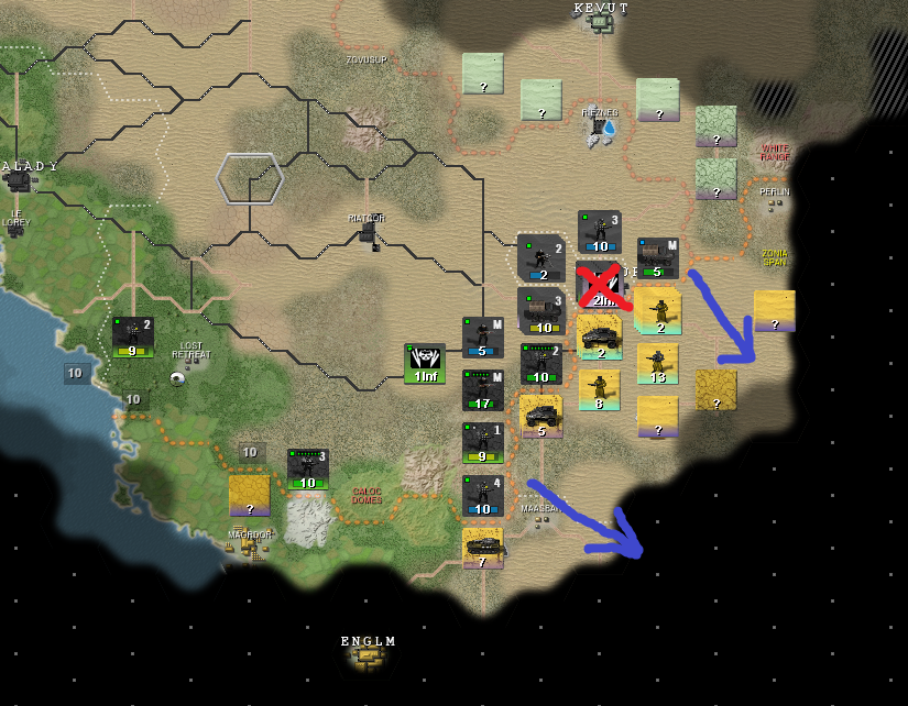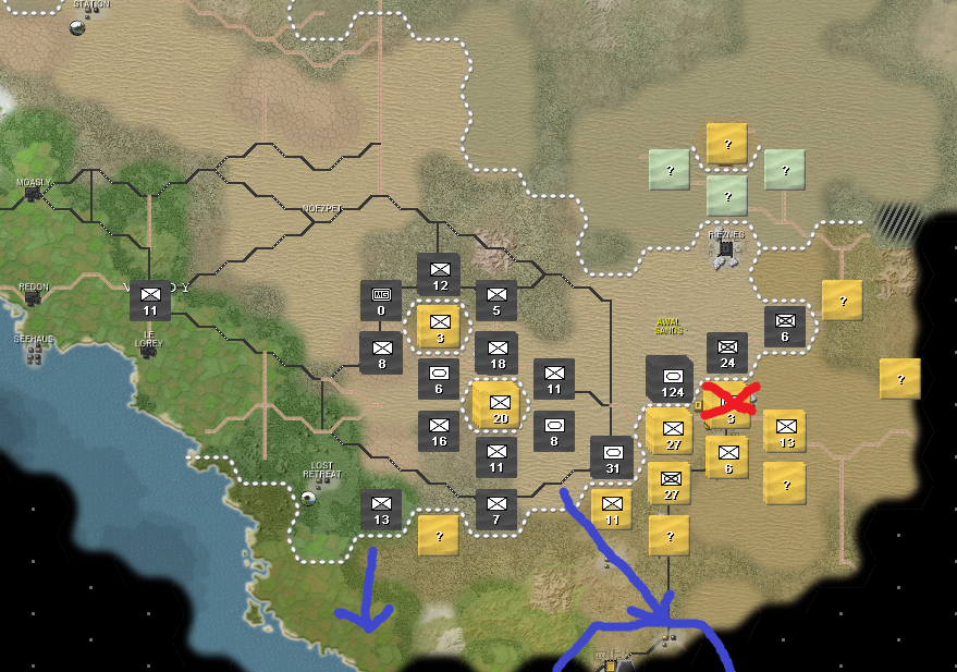 Зеленые - мои невольные союзники-леброны. Как видите, для них война складывается не очень. Их восточный фронт с городком Фото отрезан от остальной части страны горами, снабжение шло по достаточно узкому коридору с нормальным ландшафтом, но обведенная желтым группировка попов его перерезала. И тут врываюсь я. Синий - бывшая граница с попами. Первым же ходом я рванул к их пограничному городу, отмеченному красным крестом, через этот город проходит снабжение всей северной группировки желтых, следовательно освобождая его я позволяю зеленым лебронам деблокировать их восточную группировку. Попы по направлениям желтых стрелок отводят войска, стремятся избежать окружения и прикрыть жопу.