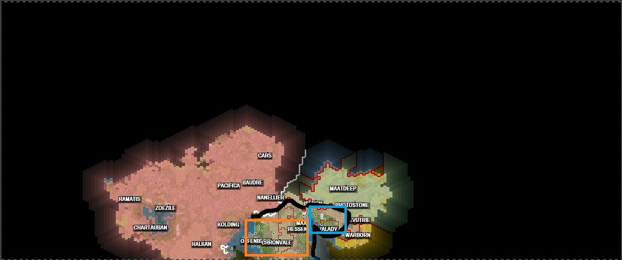 Чтоб вы понимали масштаб игрушки. Синий квадрат - территория, на которой происходили действия выше. Оранжевый квадрат - война в прошлом посте.