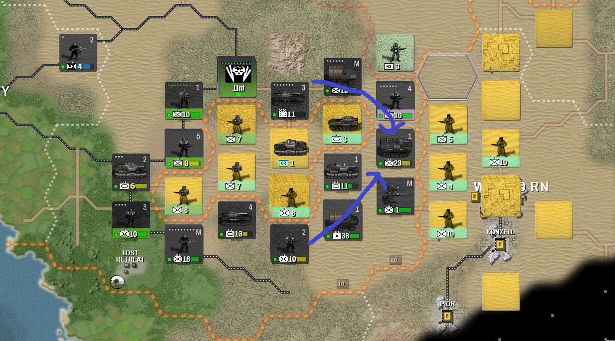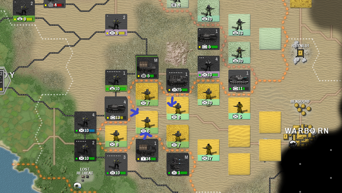 Наступление чутка застопорилось из-за топливного кризиса, но вот уже подвезли дизелька и маленькие квадратики у войск позеленели. Даже небольшая желтая часть попала в котел. Зеленым крестом помечена та самая тоненькая точка, через которую леброны снабжали всю свою восточную группировку.
