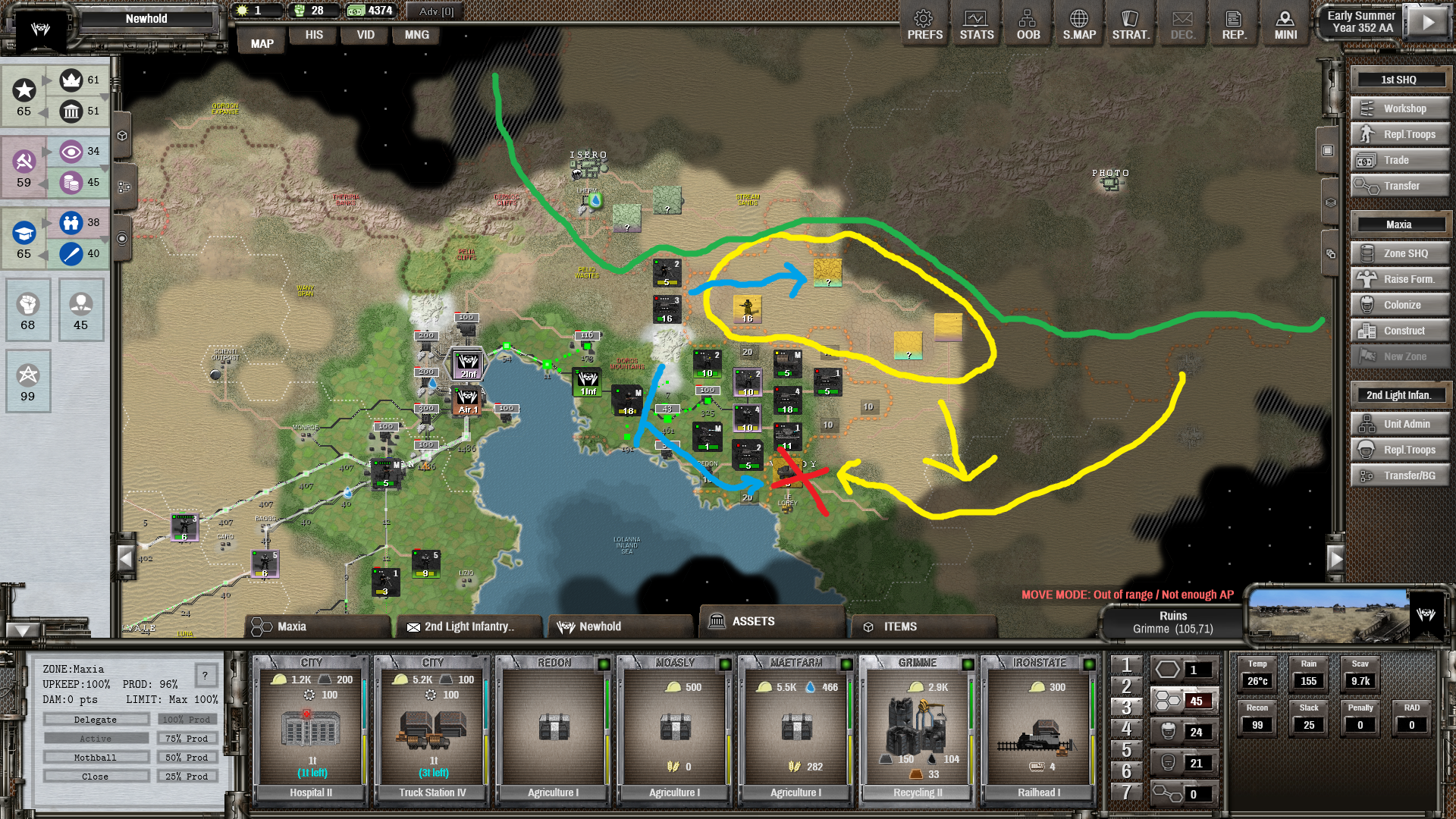 Наступление ожидаемо застопорилось. Из-за топливного кризиса я потерял темп и желтые успели подтянуть резервы. Пока их силы рассредоточены, но концентрация - вопрос времени.