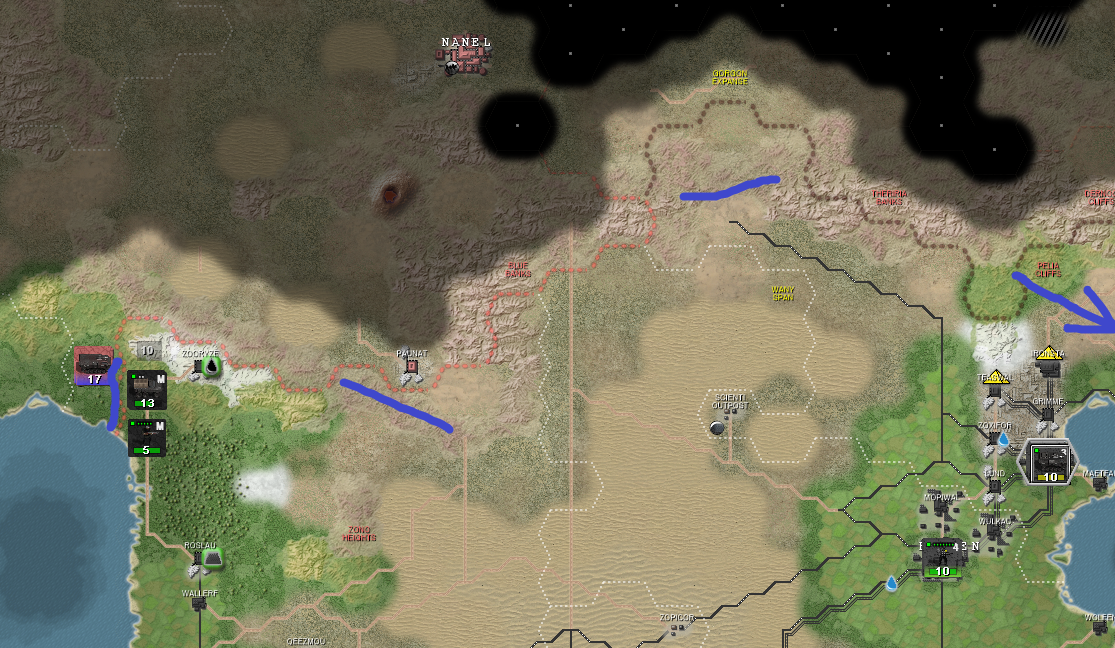 Мои границы с красными проходят по горному хребту, но синими линиями выделены перевалы. Как видите, прикрыт у меня только один, так что я роняя кал развертываю две дополнительных механизированных бригады (300 бтров, тысячи три пихотов и 160 танков) для их прикрытия.