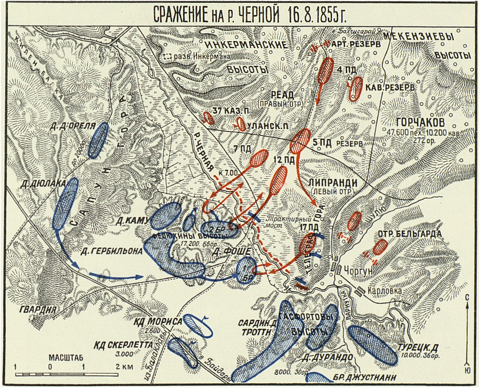 "В ночь с 3-го на 4-е Августа войска Ген. Реада и Ген. Липранди должны были спуститься с Мекензиевой горы и расположиться в долине. Все резервы оставались на горе и с рассветом должны были начать спускаться. Всё было исполнено согласно диспозиции.