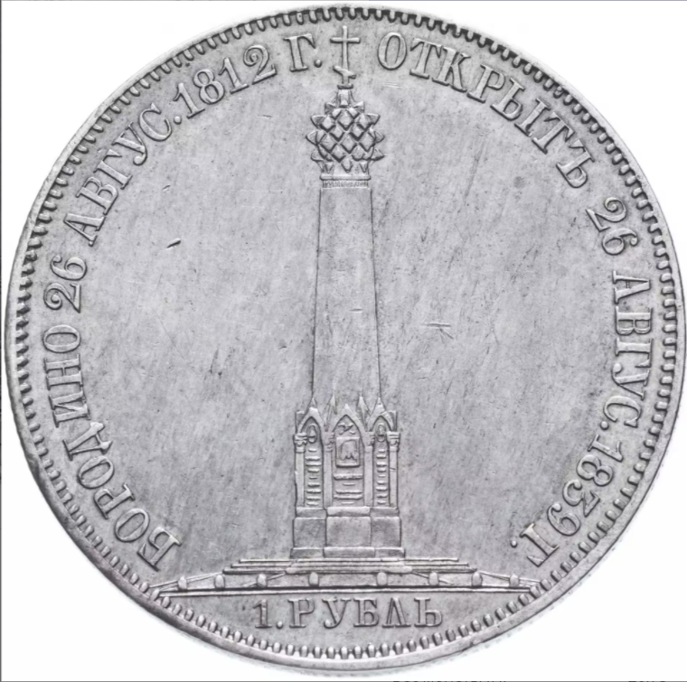 Серебряный рубль 1839 года в честь открытия монумента в память защитников Отечества на Бородинском поле.