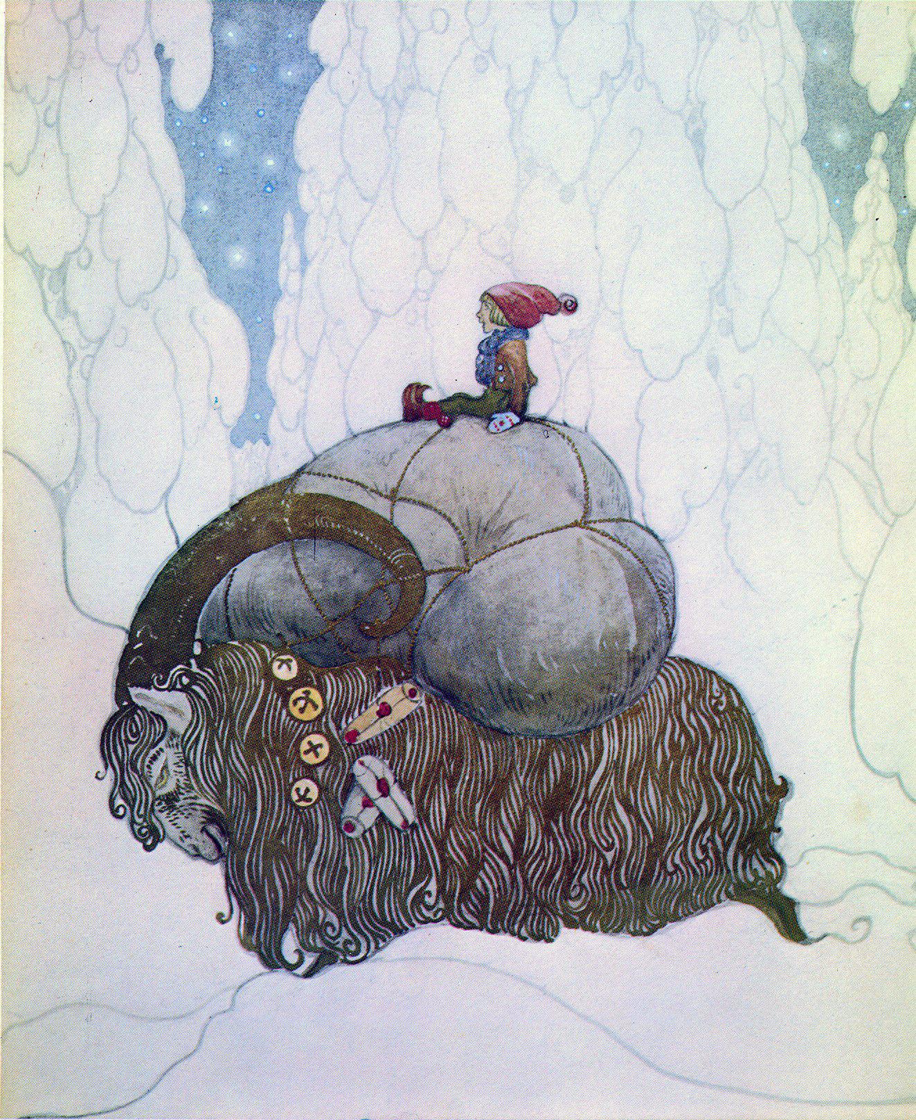 Йольский ниссе томте (у шведов он томте) верхом на йольском козле был замечен где-то на просторах Лапландии увековечен в серии рисунков шведским художником-иллюстратором конца позапрошлого века, большим знатоком эльфов и троллей, Йоном Бауэром.
