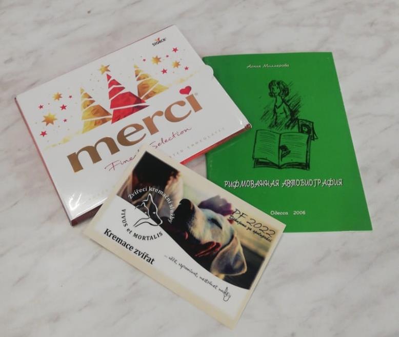 ПС пришла почтальёнка, принесла подарочки: книжечку и щчеколадку от Agnes и открытку от фирмы занимающейся кремированием животных... Я ж говорю, что у меня ни дня без трупа — реального или виртуального...