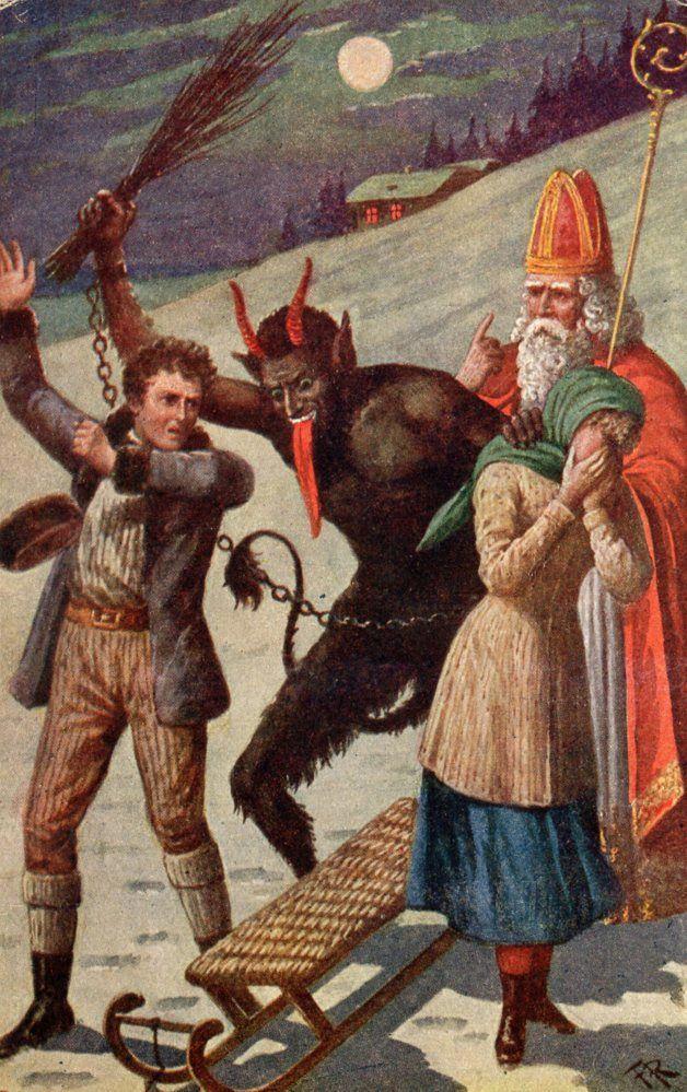 Но, конечно, самый знаменитый персонаж, главное и единственное предназначение которого — пугать и наказывать непослушных детей в канун зимних праздников — это Крампус. Не в пример вольным исландским чудовищам Йоля, творящим зло по собственному усмотрению и без всяческих ограничений, Крампус — демон на службе добра, этим самым добром подчиненный и порабощенный.