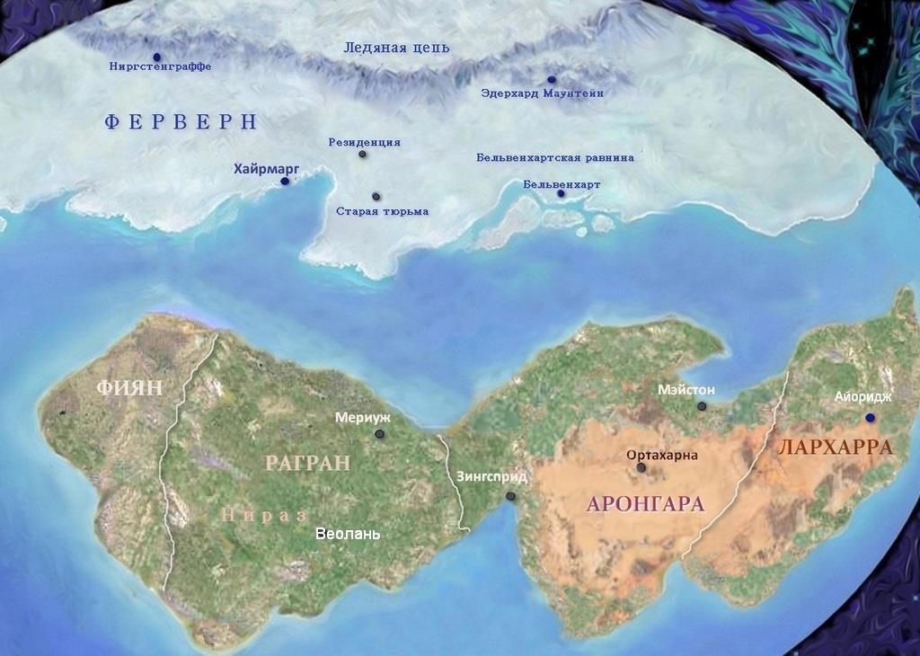 Автор: ЛюбаваПродолжила изменения на своём предыдущем варианте карты, не уходя из первоначальной основы, которую создала Sety(это великолепие можно посмотреть в её блоге), и попыталась сделать изменения с обновлённым содержанием, хотя с часовыми поясами у меня не получается "договориться", как автору проекта. Я уговорила себя(и Sety), что это придуманный мир и позволила себе унестись в изменения, какие желала душа. Sety благодушно не возражала, но все изменения я согласовывала с ней. Так что эта версия карты мира иртханов будет дополняться новыми обозначениями, а те, кто любит этот мир, смогут пофантазировать уже наяву, имея несколько вариантов карт. Первые варианты можно посмотреть в моём же блоге, в предыдущем посте, а так же прочитать, как они вообще появились. Напомню, это МИР ИРТХАНОВ по произведениям Марины Эльденберт. Добавлены новые обозначения - столица Лархарры, а так же провинция в Рагране и та самая Веолань, где такое замечательное вино - веоланское. По произведению Чёрное пламя Раграна.