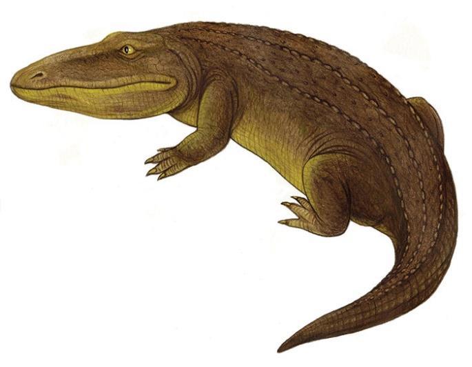 Ветлугазавр (Wetlugasaurus angustifronts) название дано по реке Ветлиги протекающей по территории Кировской, Костромской и Нижегородской областей и республики Марий Эл, на берегах которой были обнаружены кости этой рептилии. Внешне ветлугазавр напоминает крокодила длина тела которого от 75 см до 3 м.