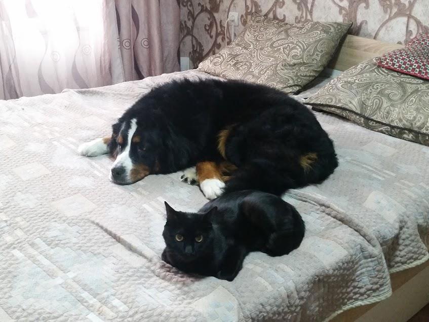 Кот оценивает ситуацию и пристраивается спать рядом с собакой. Собака провожает взглядом разочарованного ребенка, вздыхает, а в глазах читается мысль: "Ох уж эти бестолковые человеческие дети".