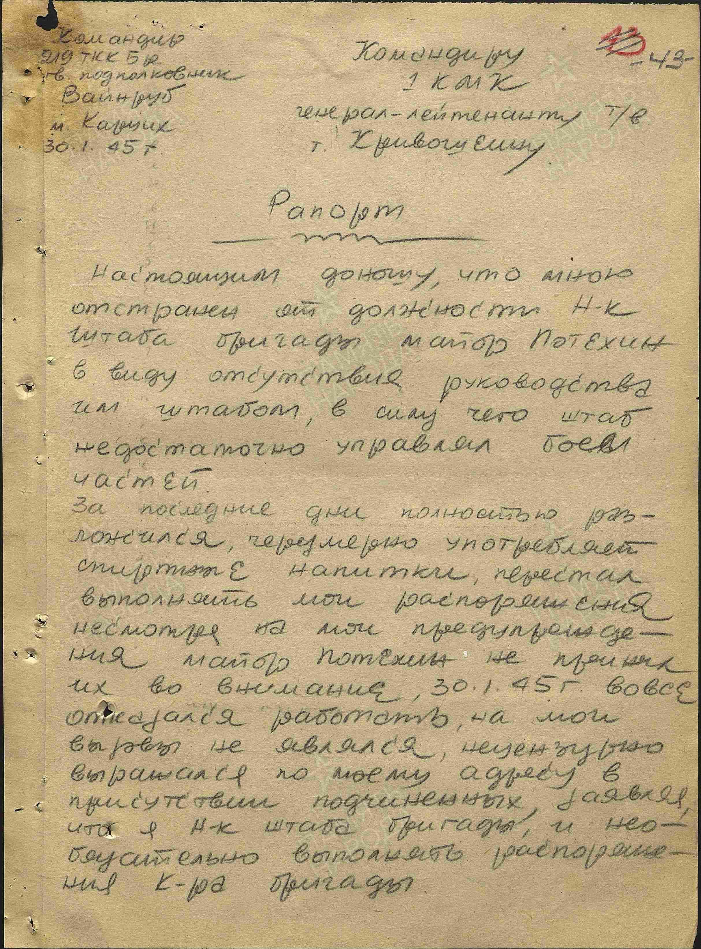 Автор: Андрей УлановОдной из первых советских частей, в январе 45-го прорвавшихся к Одеру, стала 219-я танковая бригада. К сожалению, подполковнику Евсею Григорьевичу Вайнрубу пришлось в этот момент вести бой не только с немцами... но и с собственным начальником штаба, майором Потехиным. В каких именно выражениях пьяный майор отказывался выполнять приказы комбрига, каждый может фантазировать в меру своей испорченности - как и на тему того, чего это стоило в момент захвата плацдармов на последней крупной реке перед Берлином.