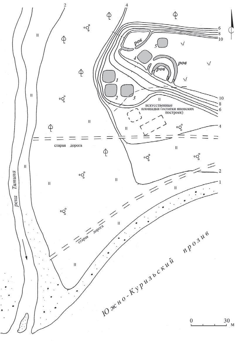 В северо-западной части террасы вырыт ров дугообразной формы общей протяженностью 32 м, выходящий на край террасы, обращённый к реке. Его ширина в верхней части – 3-4 м, глубина – около 1 м. Внутреннее пространство, окружённое рвом, имеет овальную форму размером 25х12-15 м. В западной части рва, на расстоянии 10 м от его выхода на край террасы, имеется насыпной проход шириной 1,5-2 м." ("Памятники истории и культуры Южно-Курильского района" И.Самарин, О.Шубина)
