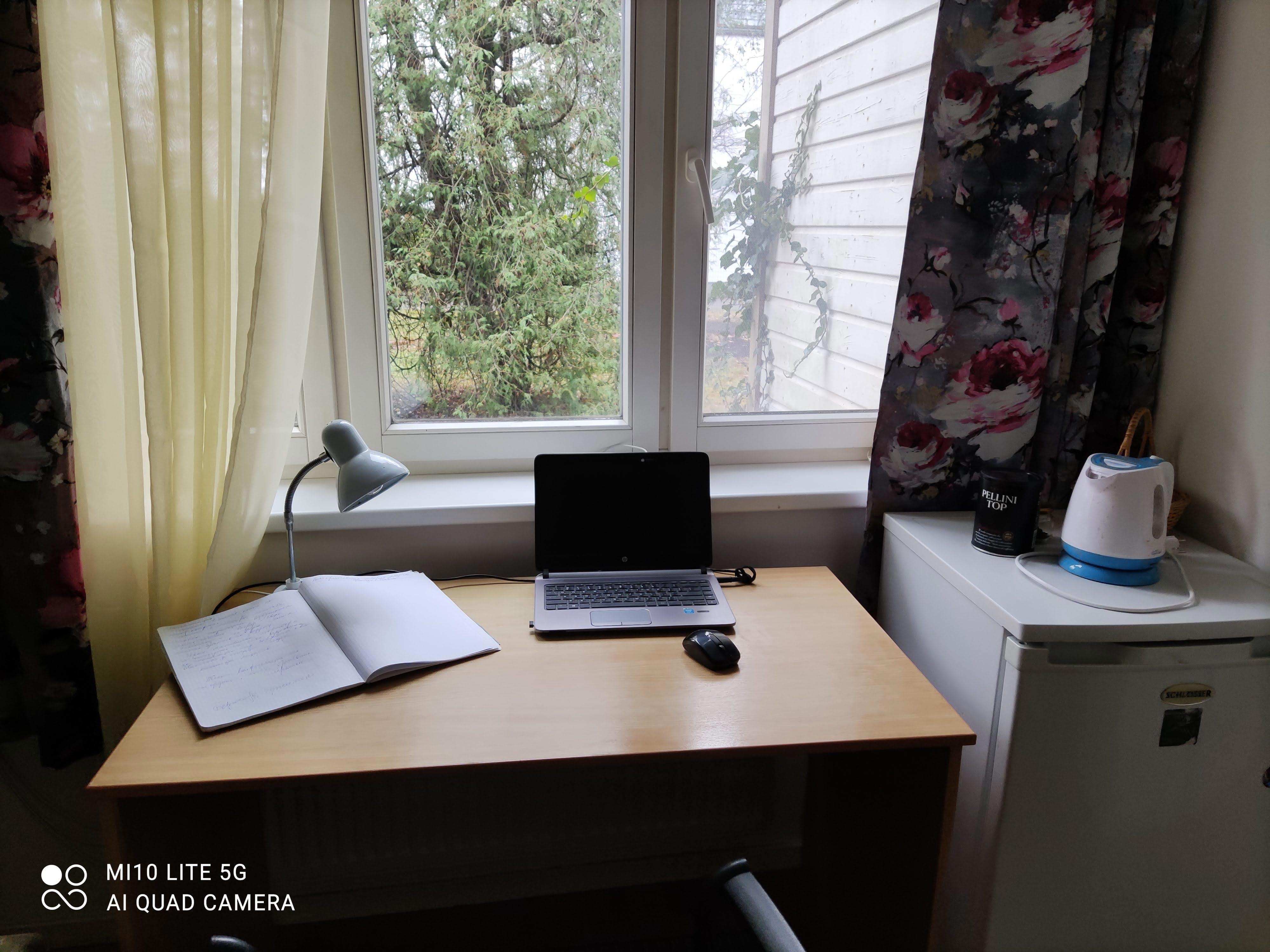 Днем все выглядело просто замечательно: отдельный номер в две комнаты, гостиная и спальня, холодильник, чайник и электрообогреватель, письменный стол для работы, свой санузел (раковина, туалет и душ). До кухни - рукой подать, там плита, большой холодильник, вся необходимая посуда и даже стиралка. Живи - не хочу!