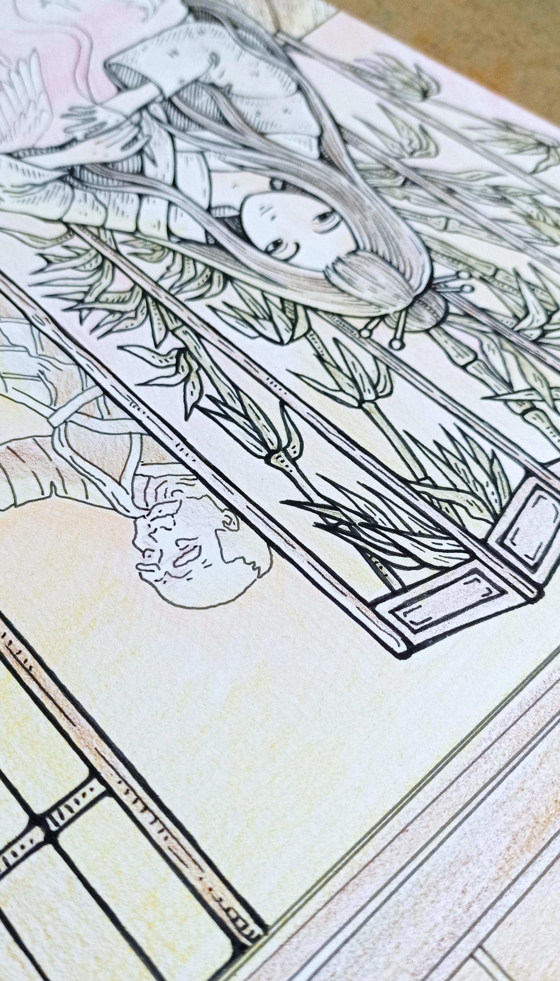 Иллюстрация к Японской сказке про журавля в процессе создания.