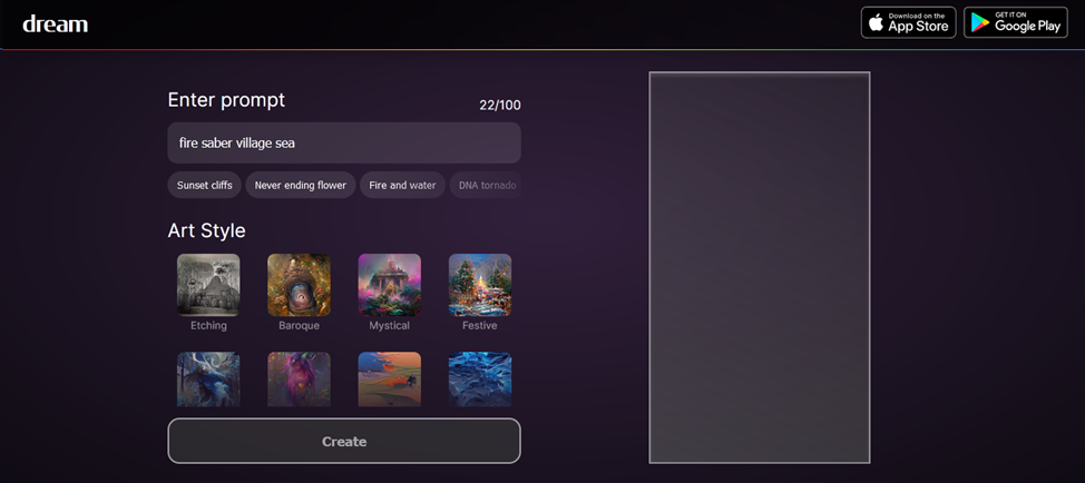 Принцип работы: Dreams создаёт изображение по запросу, предлагая выбрать один из девяти существующих стилей — фэнтези арт, стимпанк, тёмное фэнтези и другие. Другими словами, нужно ввести запрос в отведенную строку, выбрать стиль и нажать кнопку запуска.