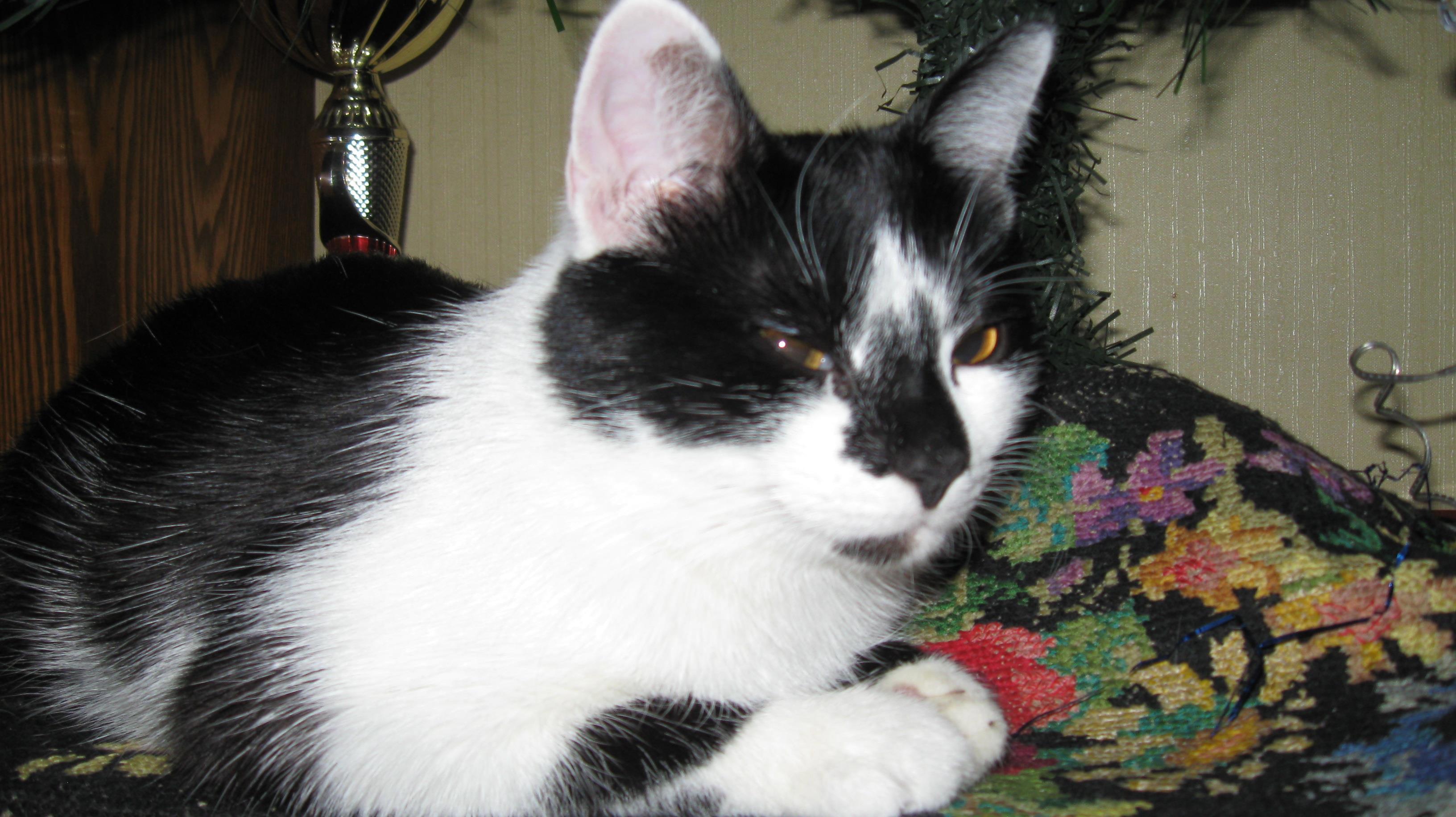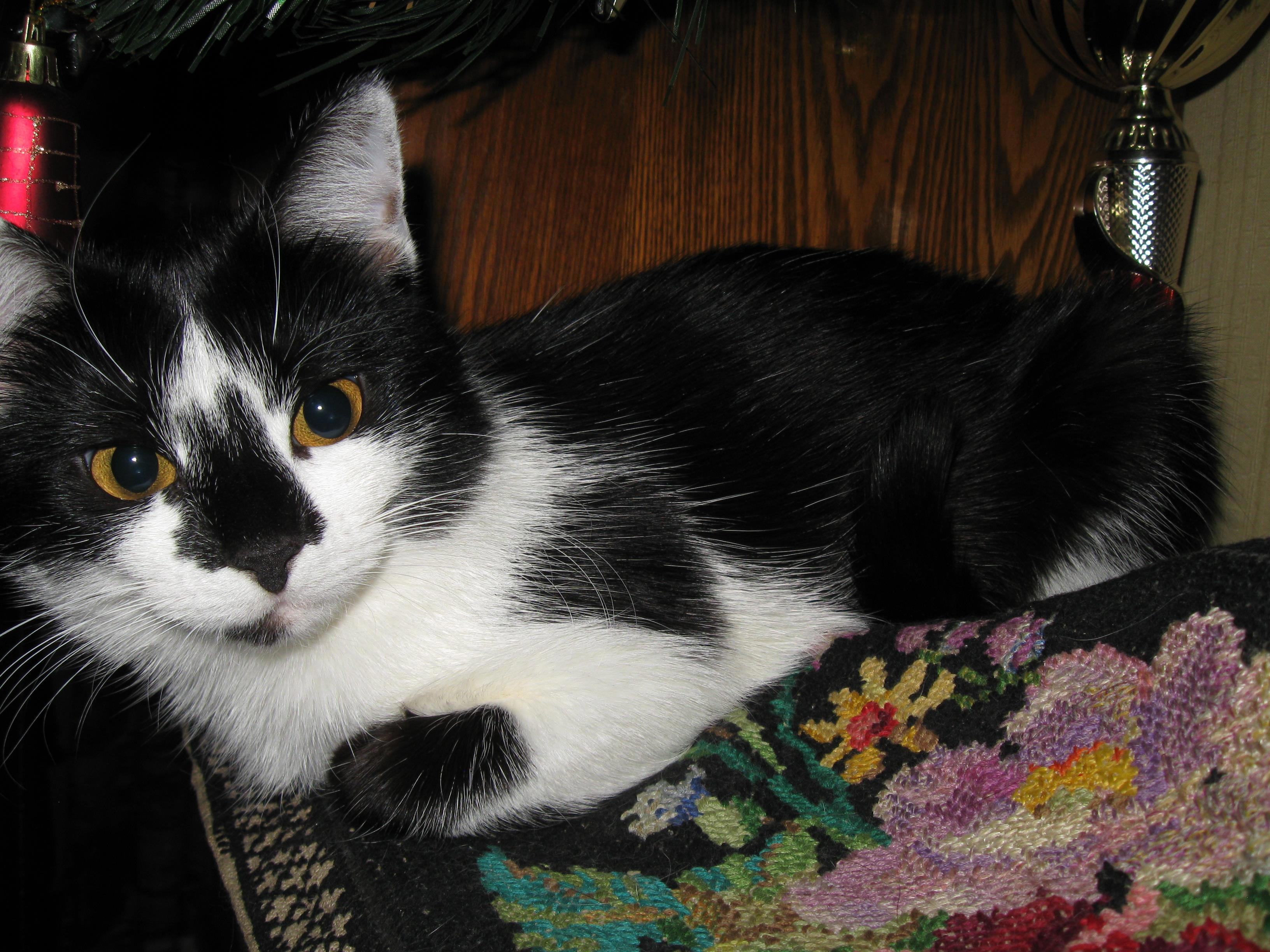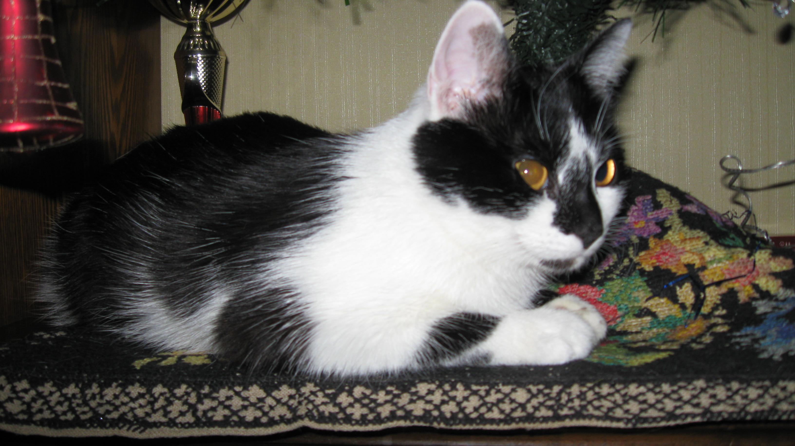 Автор: Коган Мстислав КонстантиновичЭту толстую жопу мы подобрали практически с улицы (неделю была в передержке вроде бы) где-то год назад. За год она растолстела и превратилась в полностью домашнюю кошку, которой нафиг не нужна улица, зато очень даже нужна новогодняя ёлка (пришлось ёлку сажать на двусторонний скотч)