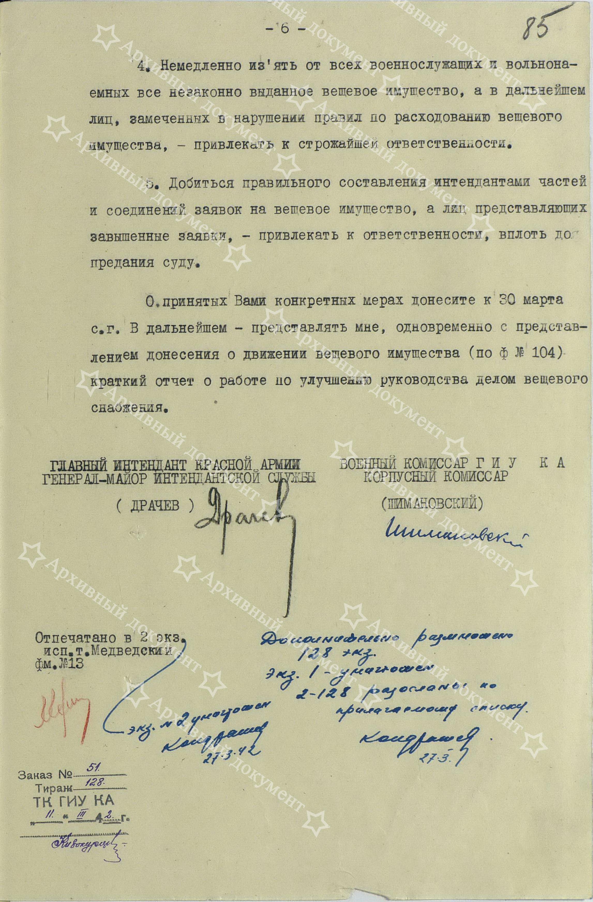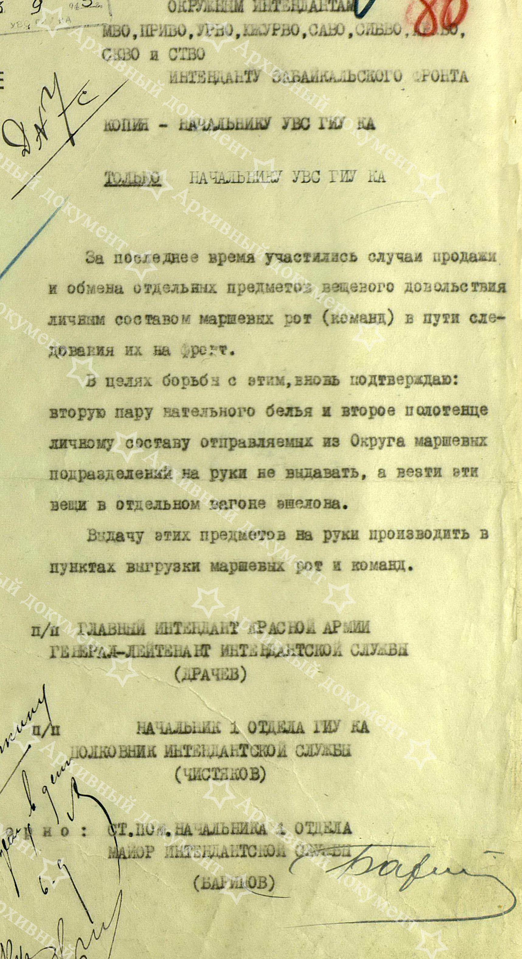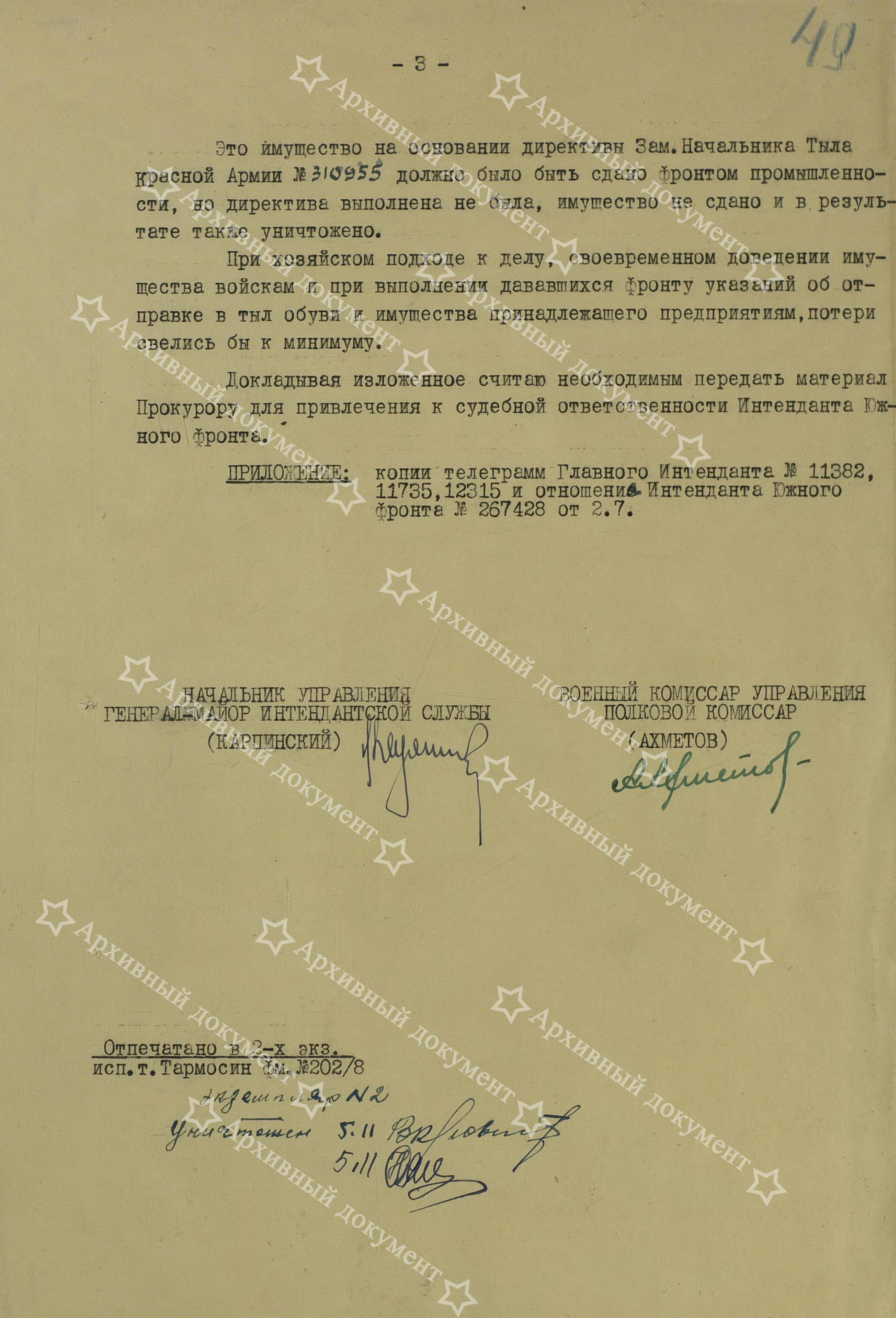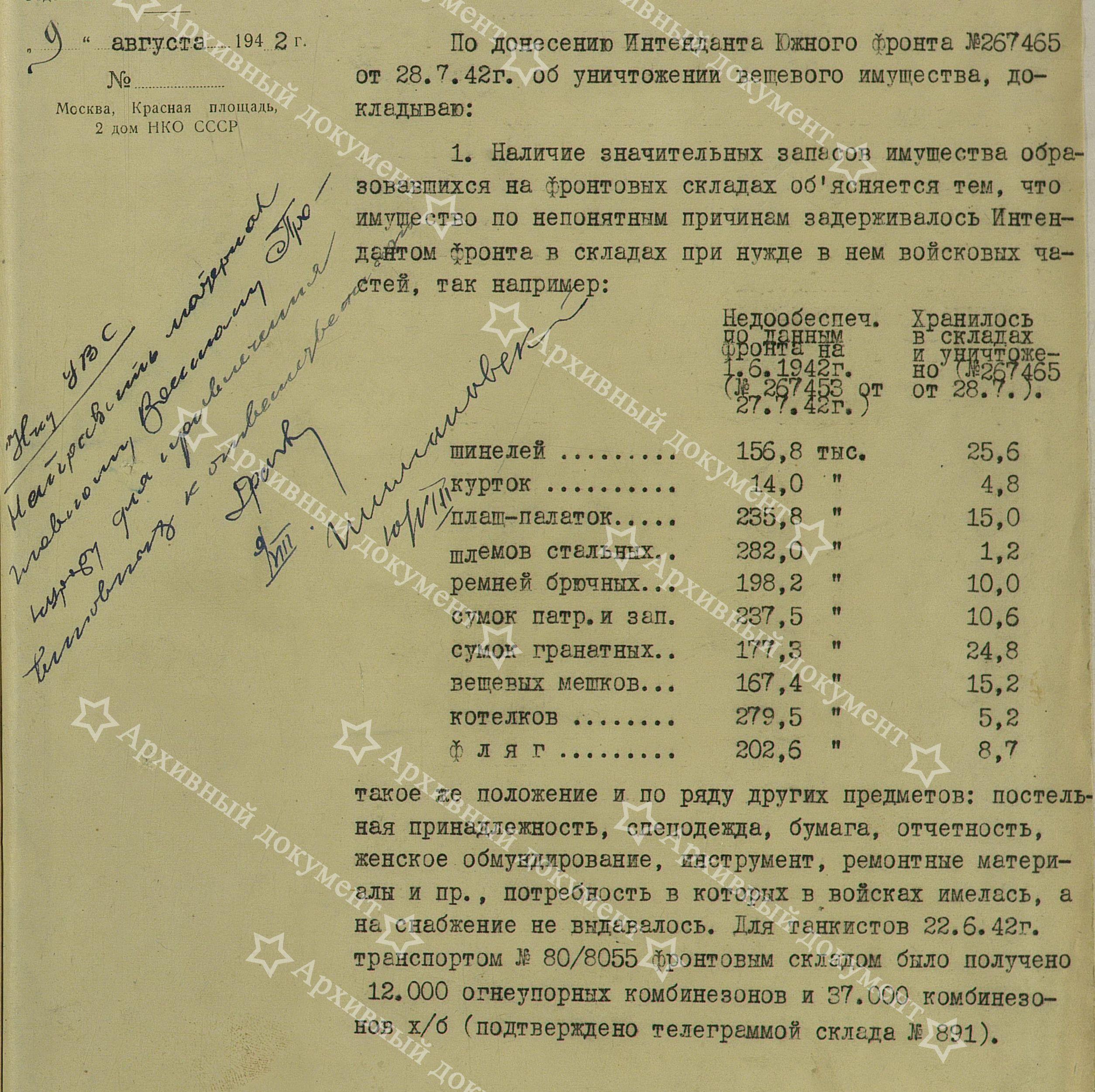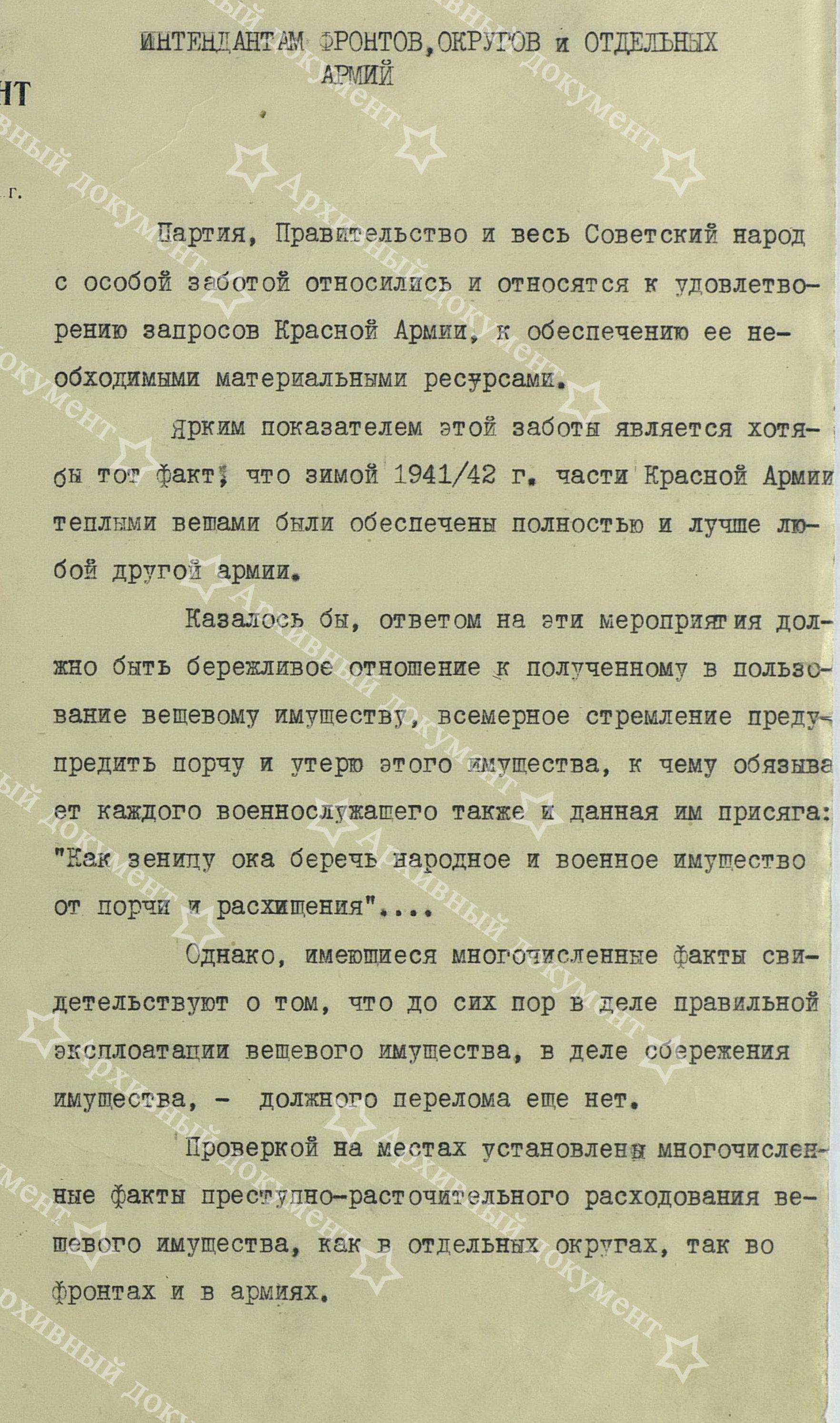 А теперь перейдём собственно к обозначенной теме. На днях, при общении с читателями, разговор зашёл о танковых огнезащитных костюмах. Сразу вспомнились прочитанные материалы расследования, в отношении интенданта фронта, который своей ленью, не распорядительностью и безответственностью, лишил фронт обмундирования, фактически, как и в 1941 году, подарив его гитлеровцам. На первом листе документа есть резолюция Главного Интенданта КА генерала П.И.Драчёва о передаче дела интенданта фронта в прокуратуру. Предлагаю вам прочитать документ:
