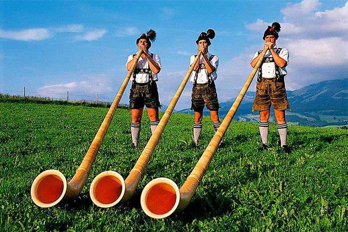 Альпийский рог (нем. Alphorn) – деревянный духовой инструмент басово-тенорового регистра, традиционный для альпийских немцев в Баварии, Тироле и Швейцарии. Представляет собой прямую трубу с изогнутым раструбом и небольшими ножками под ним. Обычная длина инструмента — два-три метра, но бывают мега-дудки и пятиметровой длины. Изготавливают рог из цельного ствола пихты (раструб делают отдельно и приклеивают). Для удобства переноски инструмент иногда выполняется разборным, при этом колена соединяются при помощи вставных металлических труб. Мундштук также делают вставным, часто к нему прилагается отдельное переходное колено между мундштуком и собственно трубой рога. Колено это имеет длину около 20 см. С его вставкой или удалением тональность звучания инструмента меняется. Играть на альпийском роге довольно тяжело — клапанов и отверстий, с помощью которых можно было бы регулировать поток воздуха, инструмент не имеет, этому мелодию трубач выдувает сам.