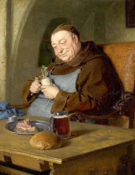 «Заинтересовавшись вопросом: почему достопочтенные люди церкви не отстают от святого Фомы [Аквинского] в весе, Мишель Руш, французский историк, с большим усердием проанализировал документы того времени касающиеся кухонь, погребков и подвалов, и пришел к любопытному выводу. Так например в аббатстве Сен-Жермен-де-Пре обычный монах поглощал в день в среднем 6882 калории! (современный взрослый человек, ведущий активный образ жизни, поглощает примерно 2000-2400 калорий).»