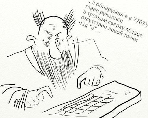 Но благодаря Вашему письму я обнаружил в 7635-й главе рукописи на 18-й странице в третьем сверху абзаце отсутствие левой точки над «ё» в слове «ещё». Разумеется, я немедленно исправил ошибку и внедрил недостающую точку, но теперь меня гложут сомнения.