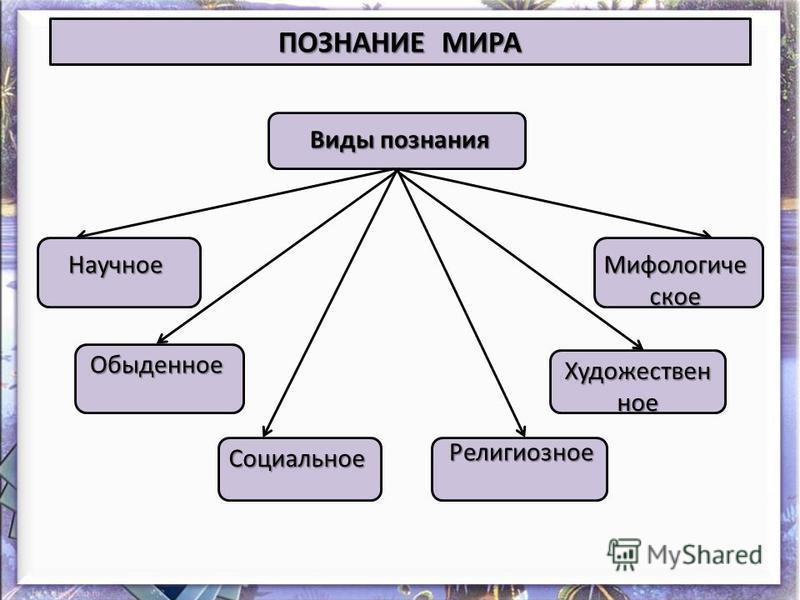 в принципе - это слайд из курса обществознания 10 класса. Мне не повезло. Возможно в те времена, когда учился я, этой картинке в учебнике не было, а есть вероятность, что я просто прогулял урок. Но, тем не менее, про виды познания я в конце концов узнал. Из учебника. Другого и по другому поводу. Вообще во всех учебниках там были всякие слова по поводу предмета, метода и тому подобной ерунды. Ну, как в начале кажется ерунды.