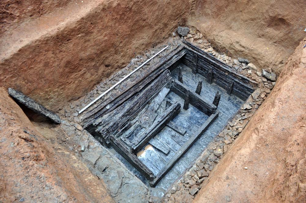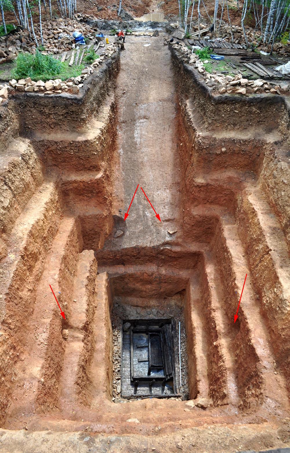 Вот свежераскопанный курган в Китае. Оцените объём земляных работ и деревянный «дом» для покойного: