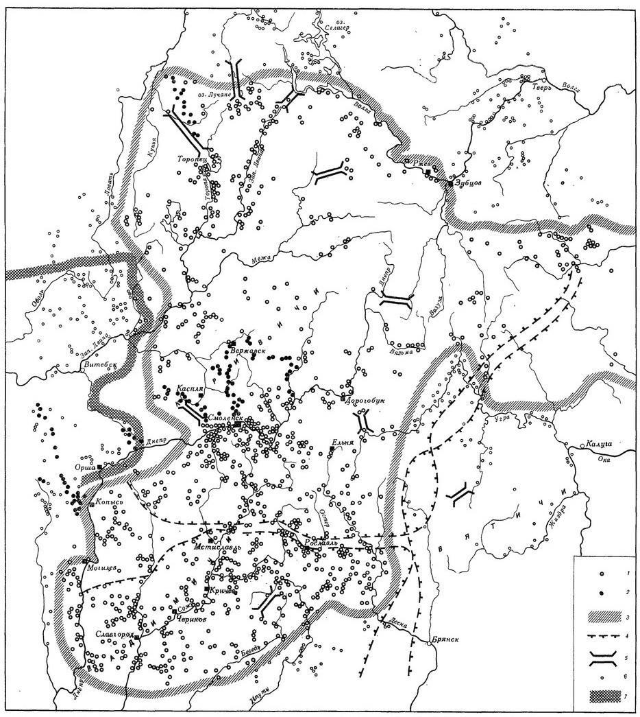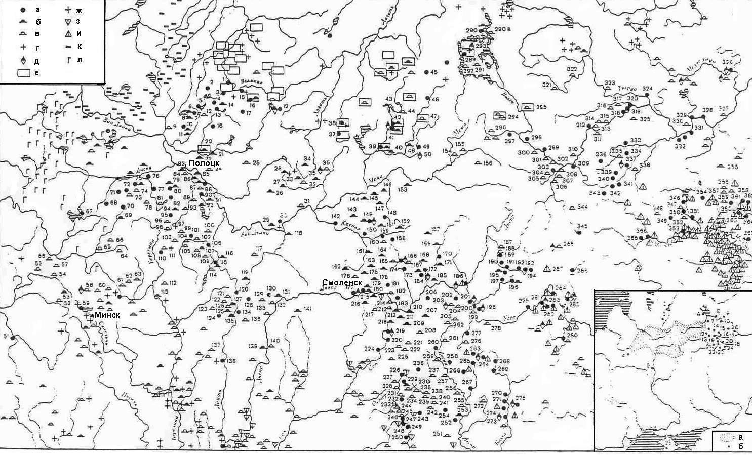 Вот ещё одна примерно оттуда же. Алексеев говорит, что это карта курганов кривичей 9-13 веков. Ну, слава богу, хоть здесь не сказали про кочевников:
