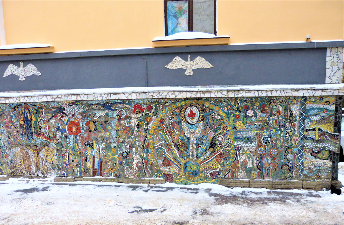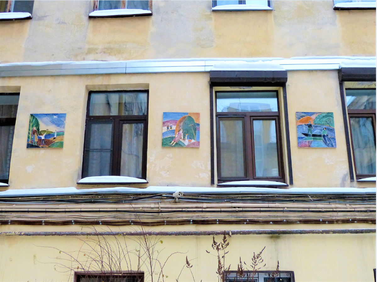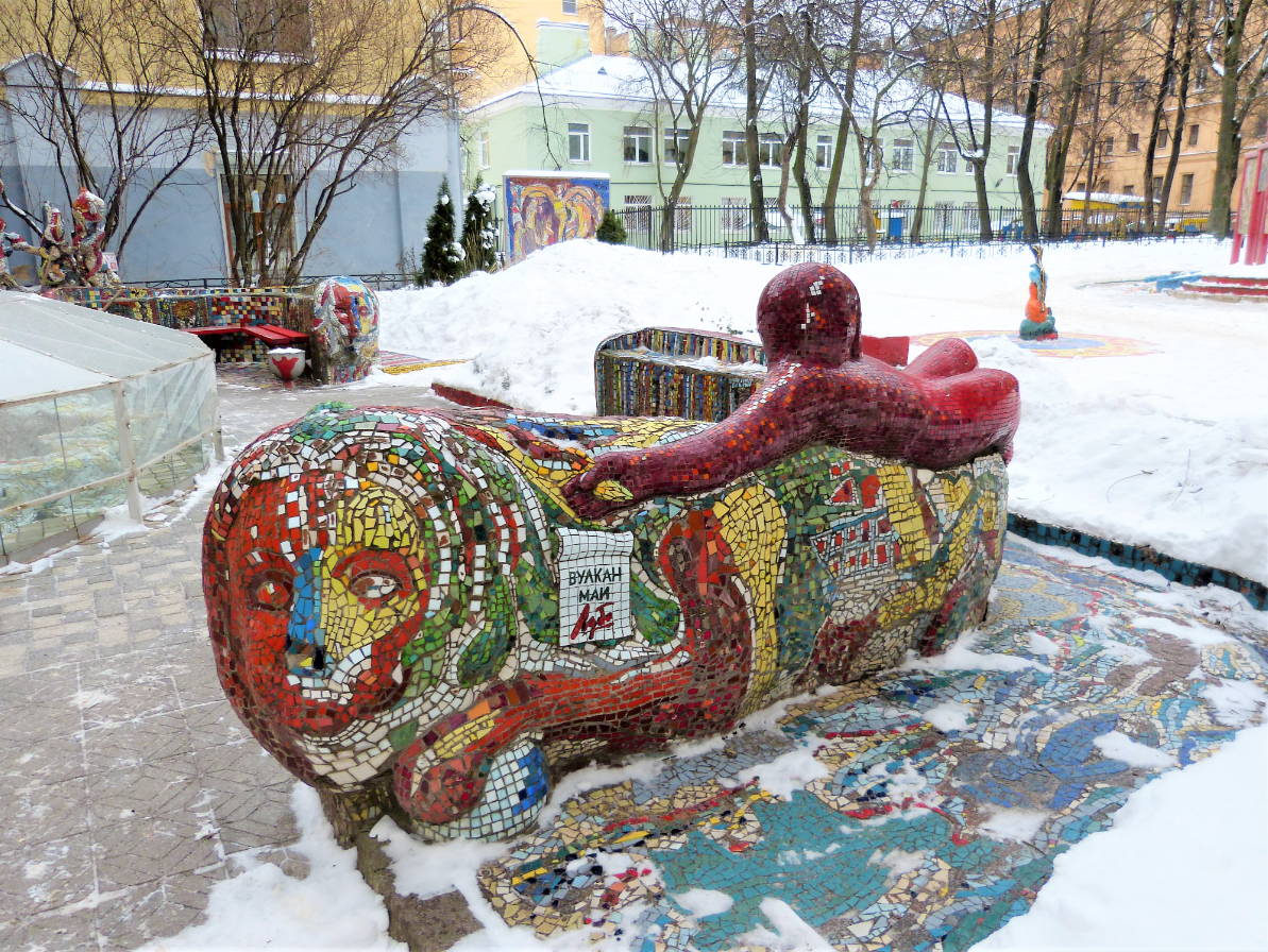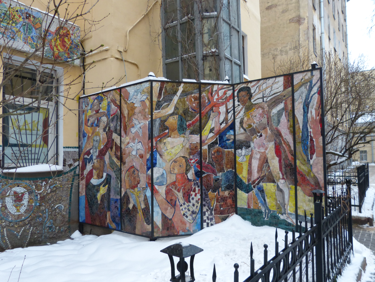 Но приятнее всего было зайти в Мозаичный дворик между набережной Фонтанки и улицей Чайковского, творение художника Владимира Лубенко и его учеников из Малой Академии искусств. Это как раз то, что доктора прописали для Серолюбова!