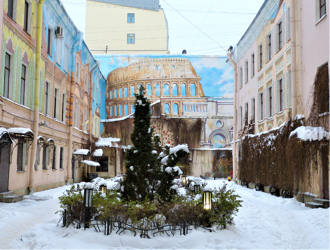 А хочется упомянуть более весёлые питерские дворы. Вот есть в Санкт-Петербурге Итальянская улица, и во дворе одного из домов на ней люди сделали Итальянский дворик. Сейчас он выглядит так: