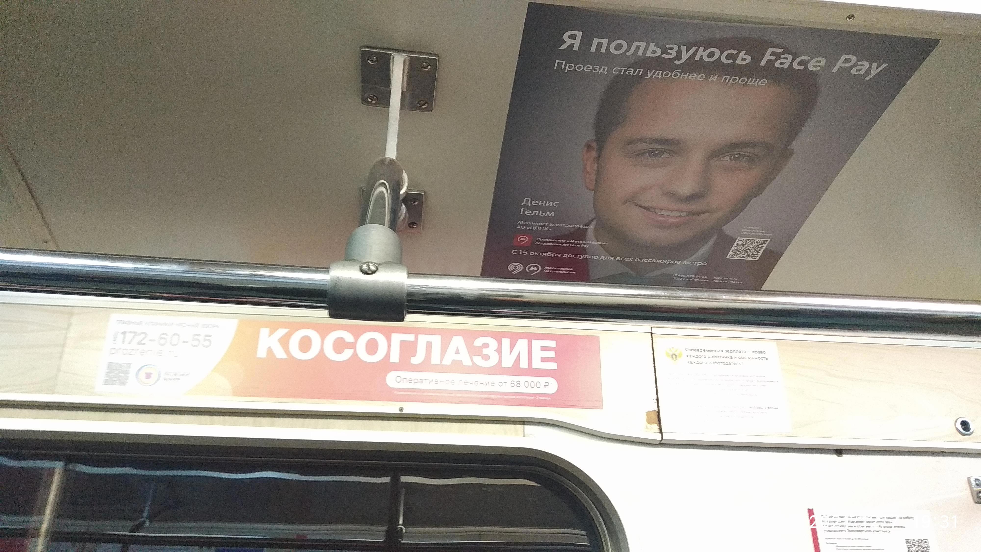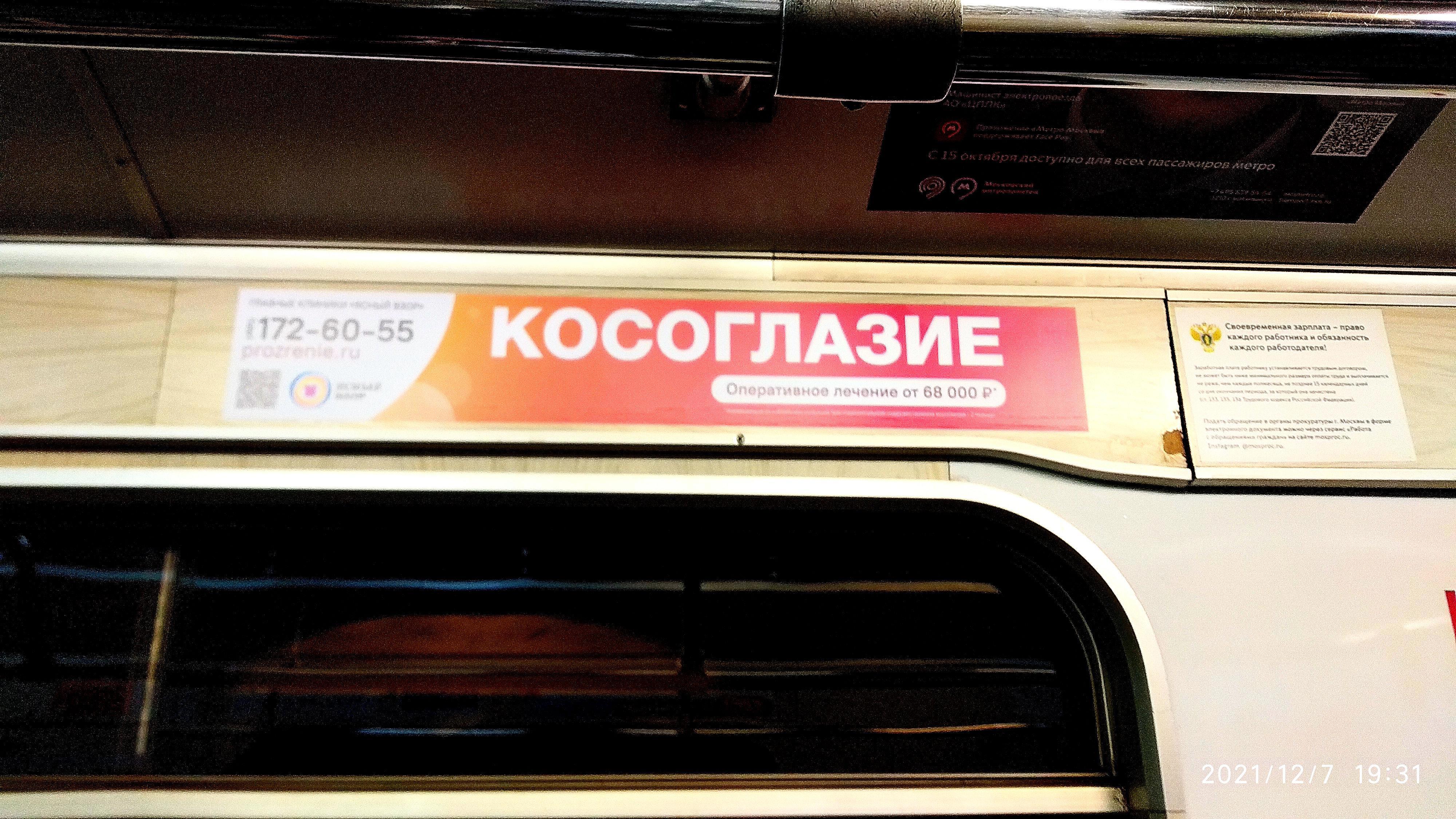 Левее и ниже постера улыбающегося машиниста Московского метрополитена наклеено объявление следующего содержания: "любое косоглазие от 68000 рублей. Ваш "Ясный взгляд"".