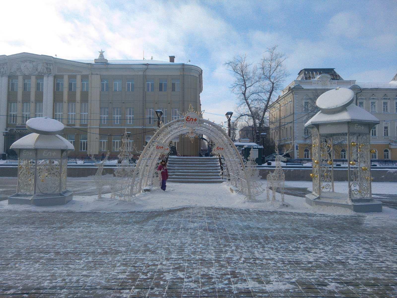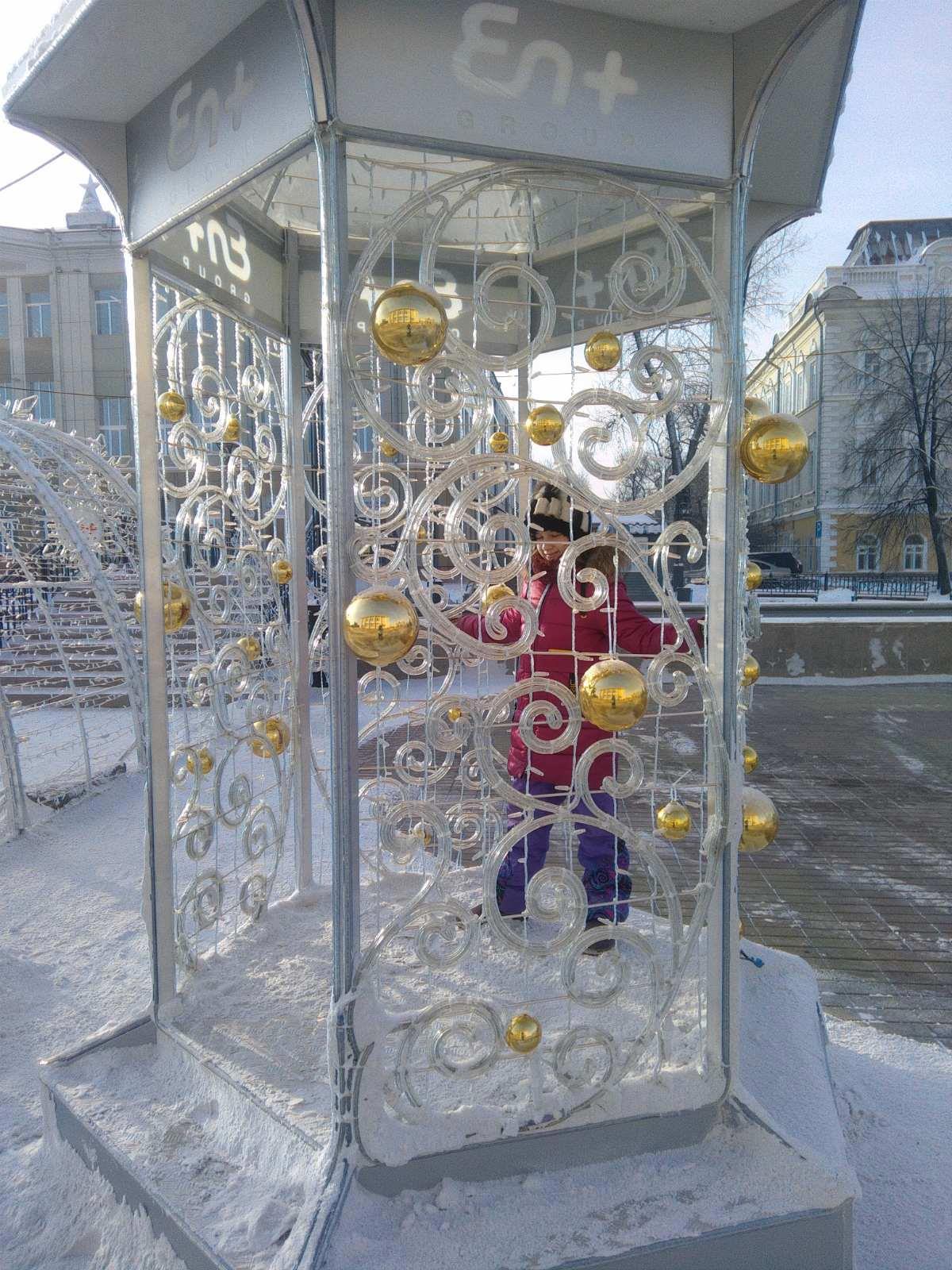 Рядом с цирком (пять минут от нашей плавательно-спортивной школы) поставили фотозону. После занятия говорю: пойдём, сфотографируемся)) Вечером, должно быть, всё переливается огоньками. Ну а днём бело-золотое и напоминает рококо: