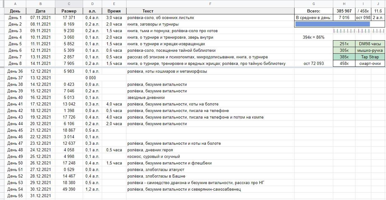 - Все-таки удалось писать почти каждый день, за всё время — пять пропусков, то есть дней, когда не писала совсем ничего. Не считая публицистики. Но она в челлендже не учитывалась.