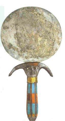 Со временем зеркала стали делать из золота и серебра и придавать им форму богинь красоты и любви Исиды и Хатхор, чтобы женщина, любовавшаяся на себя в такое зеркало, получила вечную красоту и защиту от зависти.В Древнем Египте впервые стали использовать сурьму для макияжа бровей, ресниц и век. Первую сурьму получали из голубого пепла, привезенного из шахт Синая.