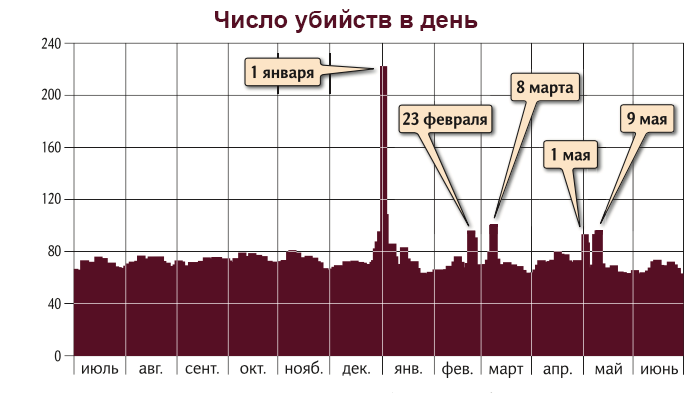 Автор: Artur FirulinВ России ежедневно убивают 70 человек. Но 1 января дополнительно убивают еще 150 человек. Этот день рекордный по числу убийств. В другие праздничные дни убийств тоже больше, чем в будни, но не настолько.