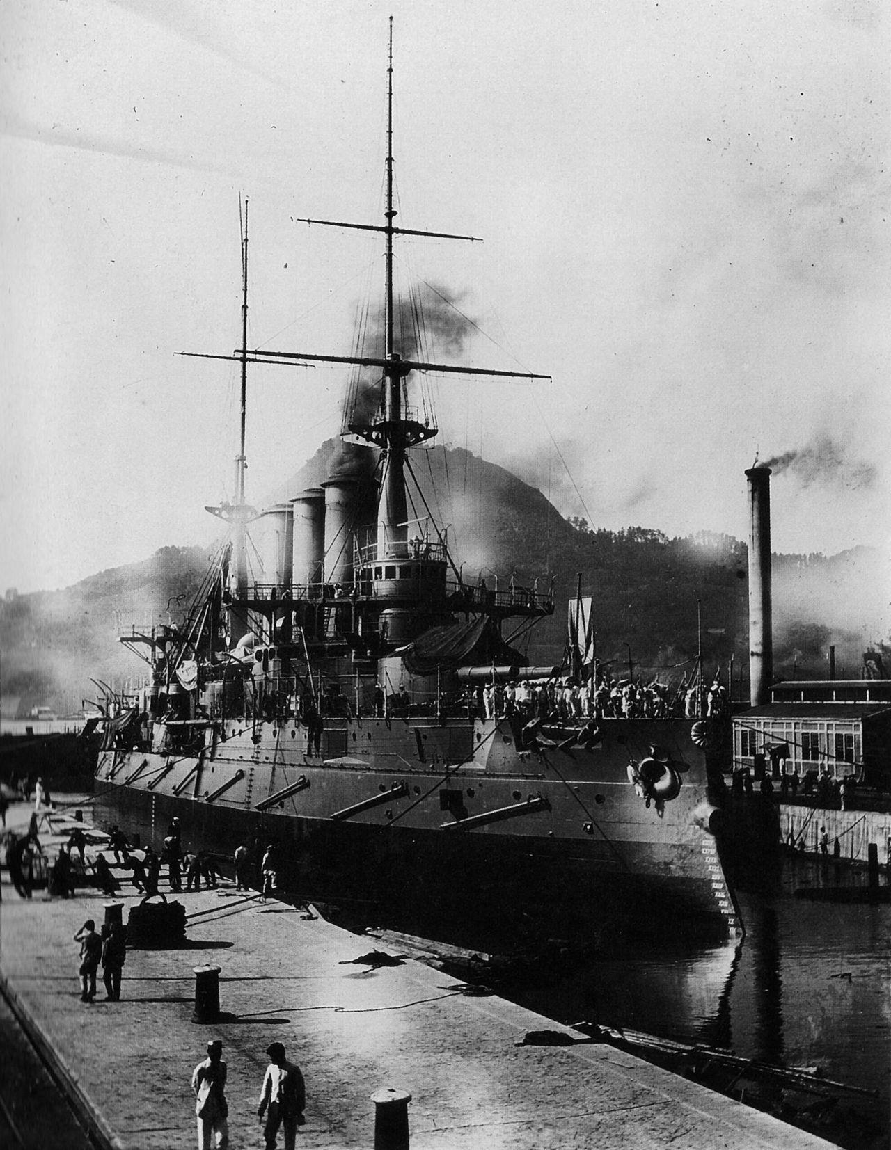 (Японский броненосец «Хидзэн», бывший «Ретвизан» во время ремонта в порту Сасебо, 1908 г.)