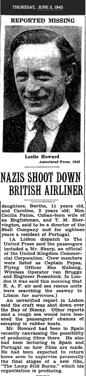 Но та "Касабланка", которую мы знаем, обрывается на сцене взлета. Фильма о том, как 1 июня 1943 года в Атлантику падал сбитый немцами самолет, на котором летел в Англию Лесли Говард, в Голливуде не сняли.