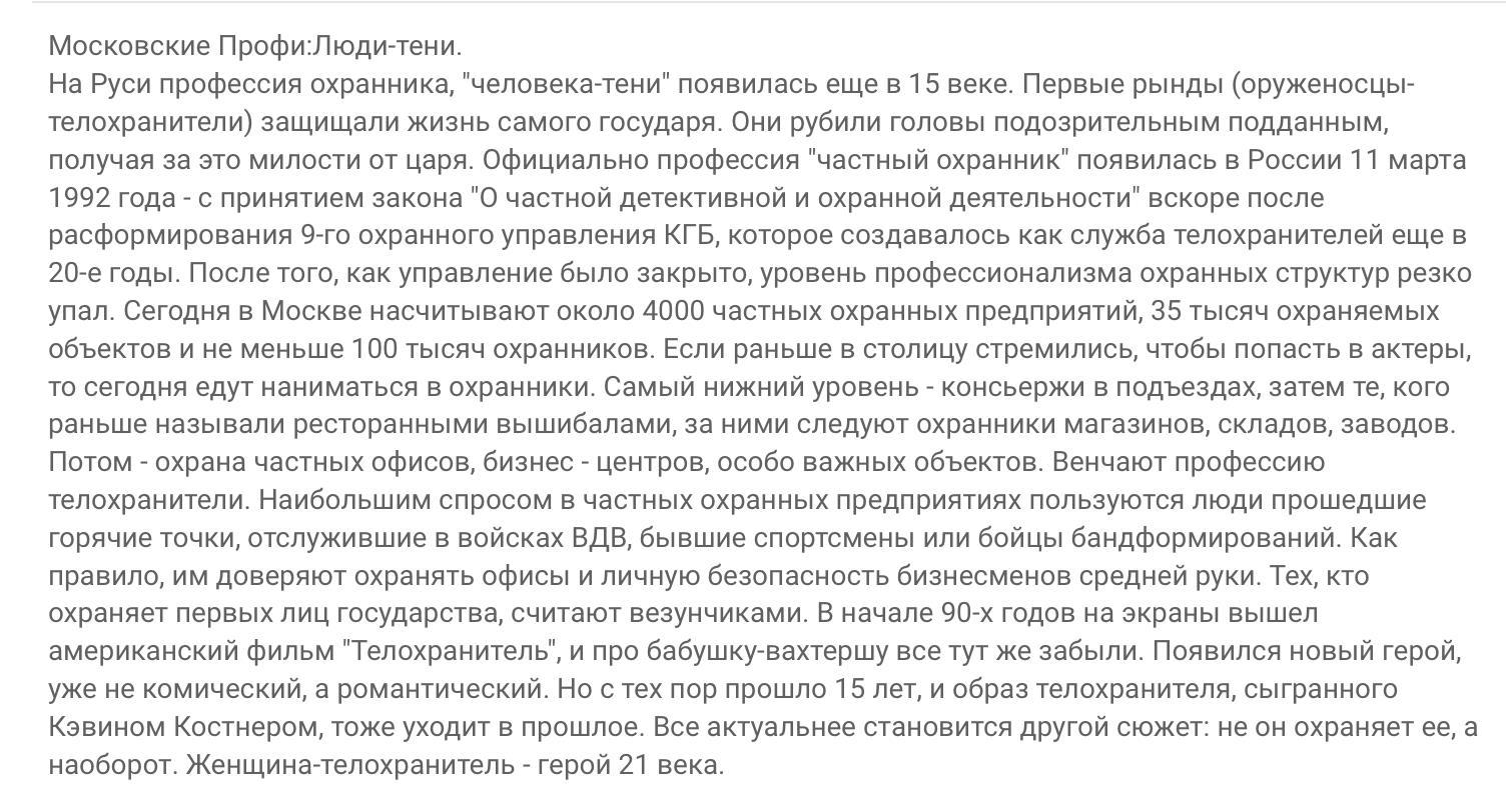 Телохрани́тель (англ.Bodyguard, от англ.Body — тело и англ.Guard — охрана) — квалифицированный сотрудникслужбы безопасности, непосредственно обеспечивающий безопасность охраняемого лица или человек, оказывающий услуги по личной охране, является одним из видов оперативного обеспечения или правительственным агентом, который защищает лицо или лица, — как правило, общественные, богатые, или политически важной фигурой (S) — от опасностей: в целом от кражи, нападения, похищения, убийства, преследования, домогательства, потери конфиденциальной информации, угроз или других уголовных преступлений. (википедия наше все)