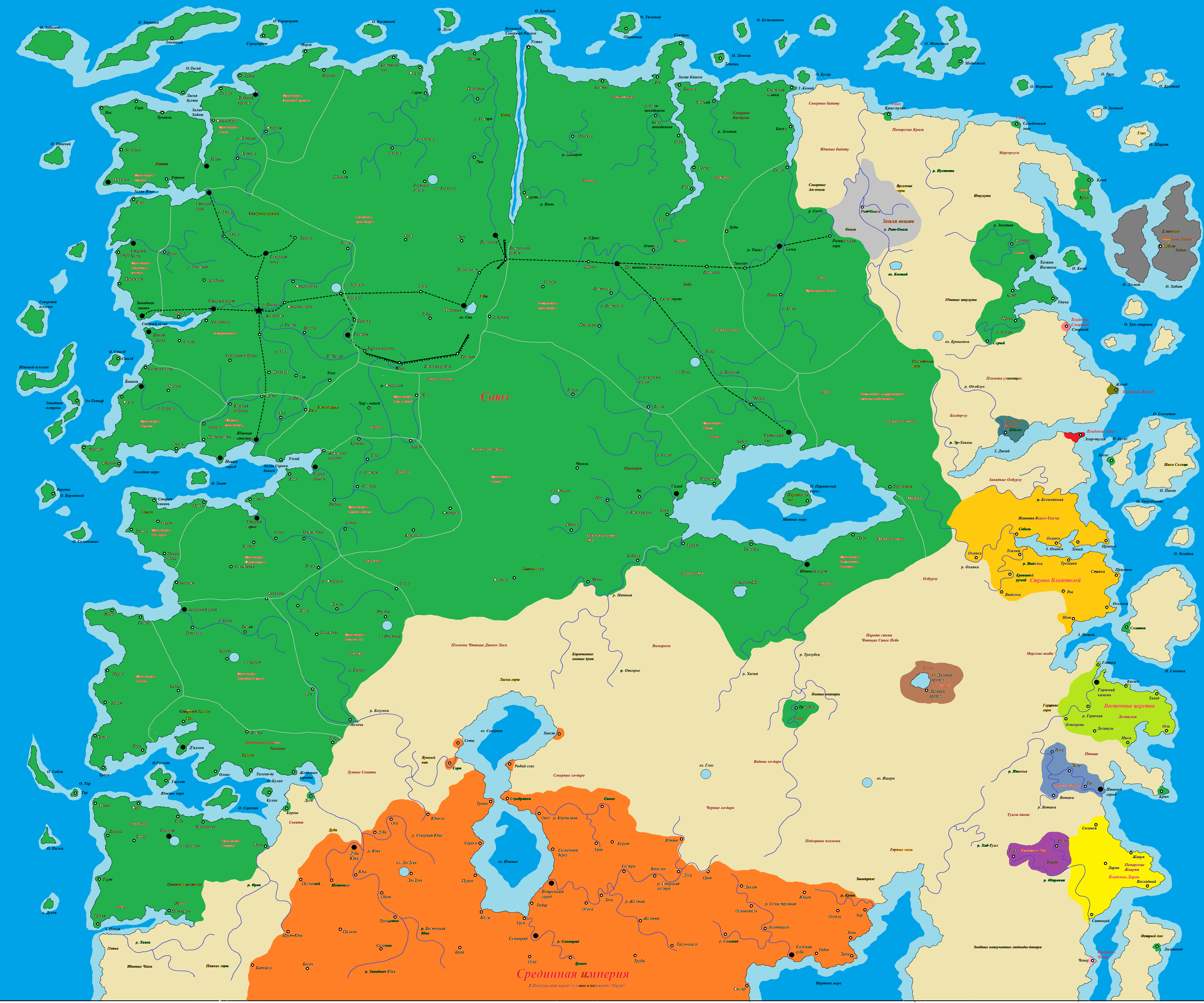 Автор: Vogulich0477В первом приближении и наскоро. Собственно, как только я немного утрясу аспект политических отношений и политическую же географию, можно будет подумать над более красивым отображением всего этого безобразия. Зеленое - Союз, оранжевое - Срединная империя. Песочным цветом окрашены земли без какого-либо серьезного гос. образования, но без дифференциации на первобытных дикарей и всякие там вождества. Светло-серые - Скаги. Возможно, один регион, вернее архипелаг на карте не указан. Почему "возможно"? Потому, что я еще не решил, будет ли им вот тот темно-серый в правом верхнем углу или дополнительно еще рисовать:)