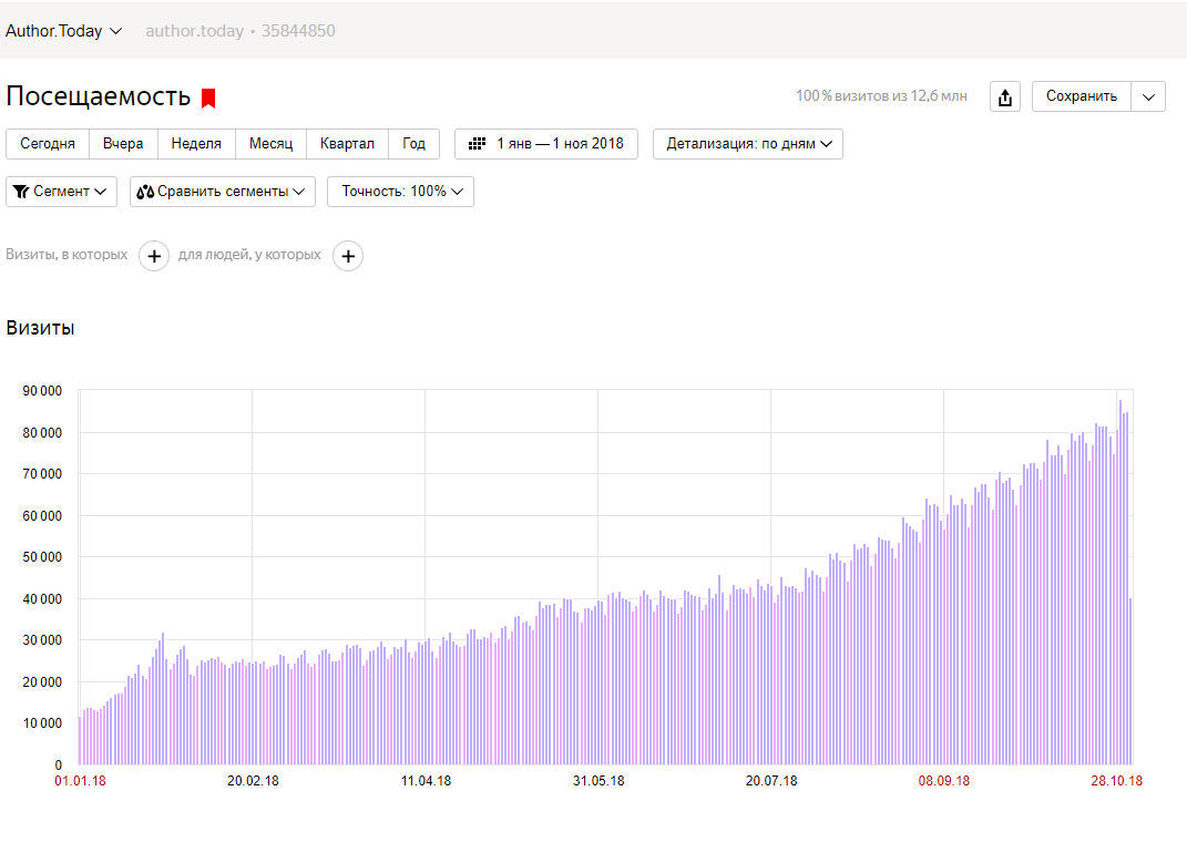 Вернемся к ЛН и их «санкциям». Причина их ввода, думаю, очевидна. Я имею в виду реальную причину, а не очередную наивную попытку выставить нас злодеями. Author.Today растёт, и растёт быстро. На сегодня АТ - один из крупнейших ресурсов «самиздата» в рунете. Чтобы не быть голословным, приведу немного цифр.