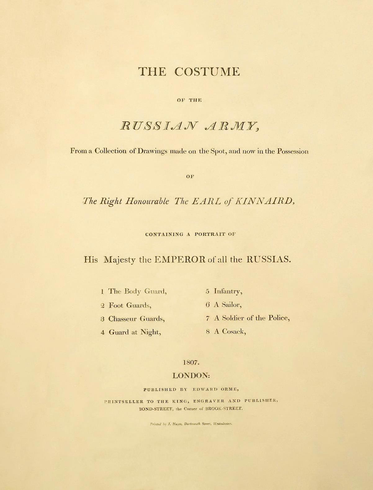 The costume of the russian army, from a Collection of Drawings made on the Spot, and now in the Possession of The Right Honourable The Earl of Kinnaird, containing a portrait of His Majesty the Emperor of all the Russias. 1807. London: published by Edward Orme, printseller to the king, engraver and publisher. Bond-street, the Corner of Brook-street. Printed by J. Hayes, Dartmouth Street. Westminster.
