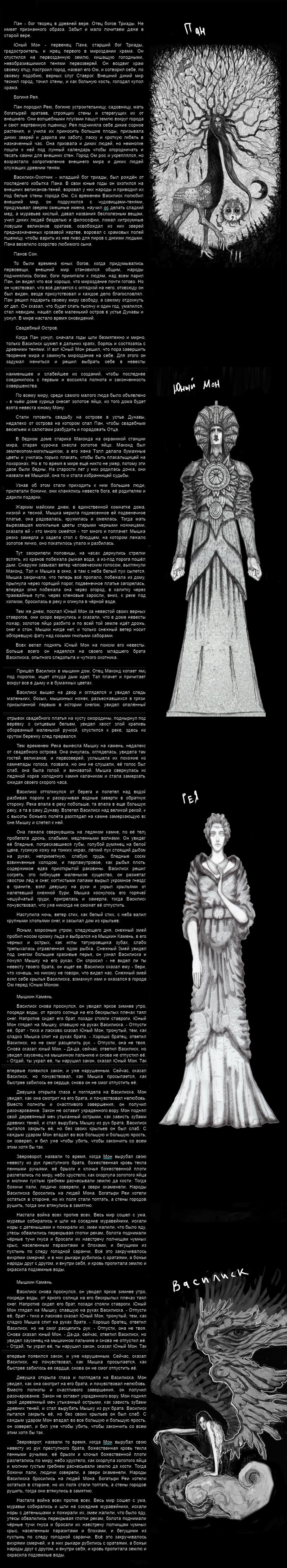 Автор: Николай АладинскийБыли у меня сомнения насчет 10-й главы, она конечно как инородное тело в тексте была и по содержанию, скорее похожа на то, что я на картинках пишу. Но по задумке она должна быть именно там, что б показывать связь древнего мифологического и современного в мире книги. Позже это будет важно, да и вообще у этого мира такое устройство, немного литургическое. К тому же будет продолжение этой сказки во второй половине книге, и там тоже важные для сюжета штуки. В общем решил поместить весь этот эпизод на продолговатую картинку