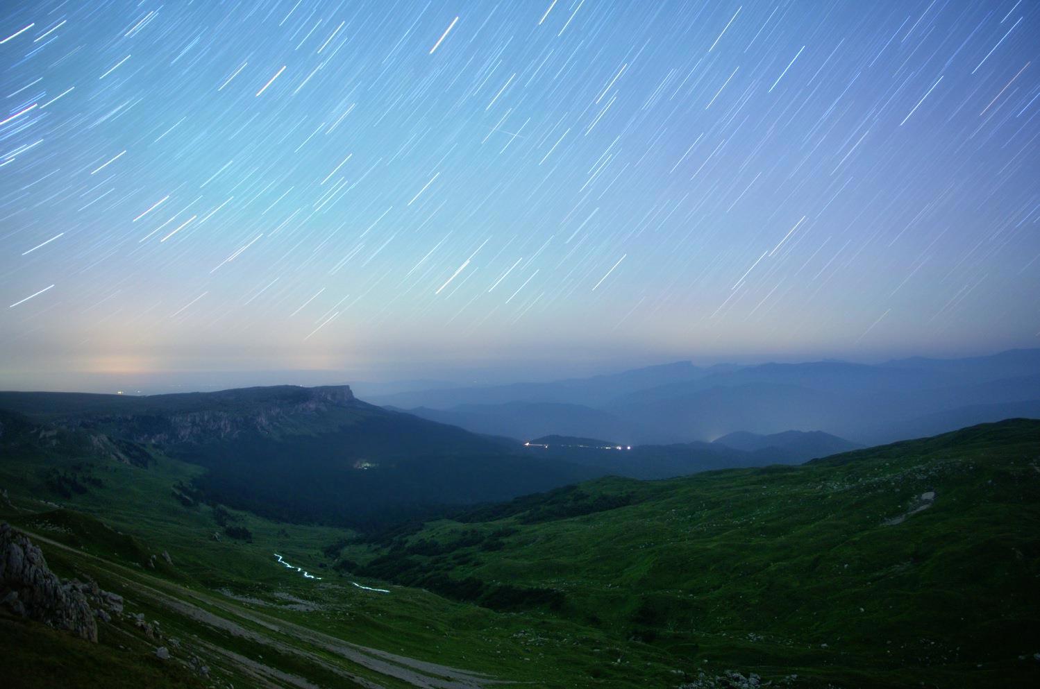 Вот это снято ночью, вдали зарницы городов, а змейка света внизу - группа туристов.