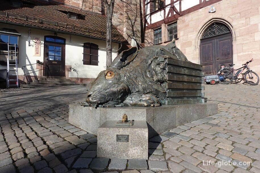 Перед домом-музеем можно увидеть довольно странный памятник, два разновеликих изваяния из бронзы на гранитных постаментах. Это "Заяц Дюрера" (Dürer-Hase Skulptur), созданный в 1984 году Юргеном Гертцем. В 1502 году Дюрер болел, поэтому никуда не выезжал из Нюрнберга. Зато он много гулял по ближним окрестностям города и во время одной из таких прогулок подобрал зайца-русака. Этот заяц потом долго жил в доме художника, а рисунок, его изображающий, стал одной из самых известных работ Дюрера. Вот в честь этого рисунка и был создан монумент.